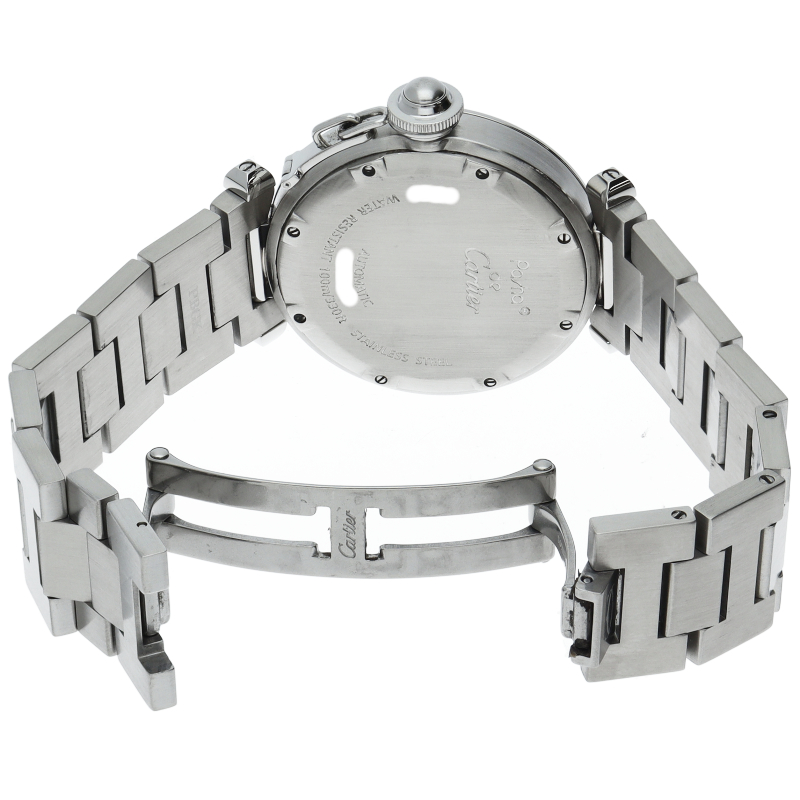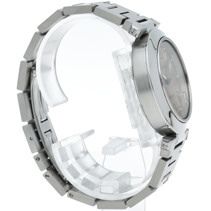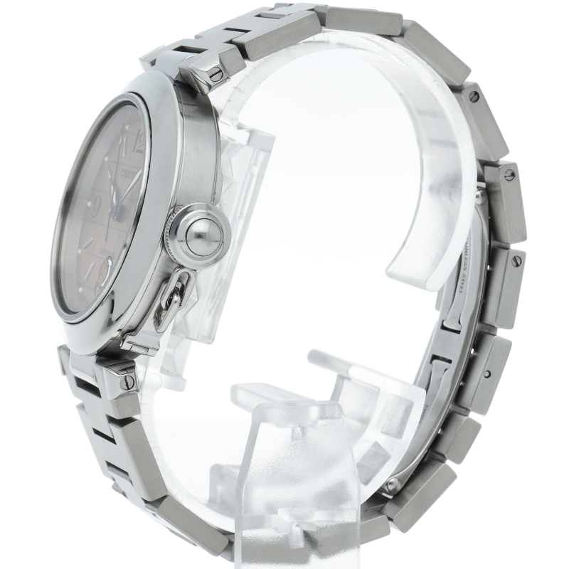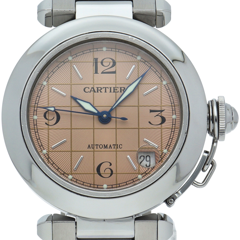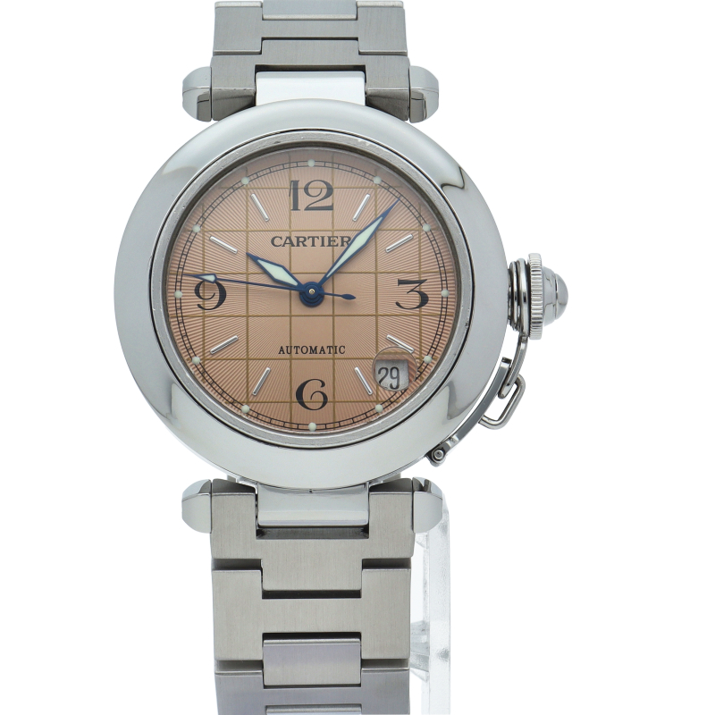 カルティエの人気パシャCシリーズ。4時と5時の間にデイト表示機能が付いた実用性のある1本。どんなシーンにも活用できるラウンドケースがオシャレです。