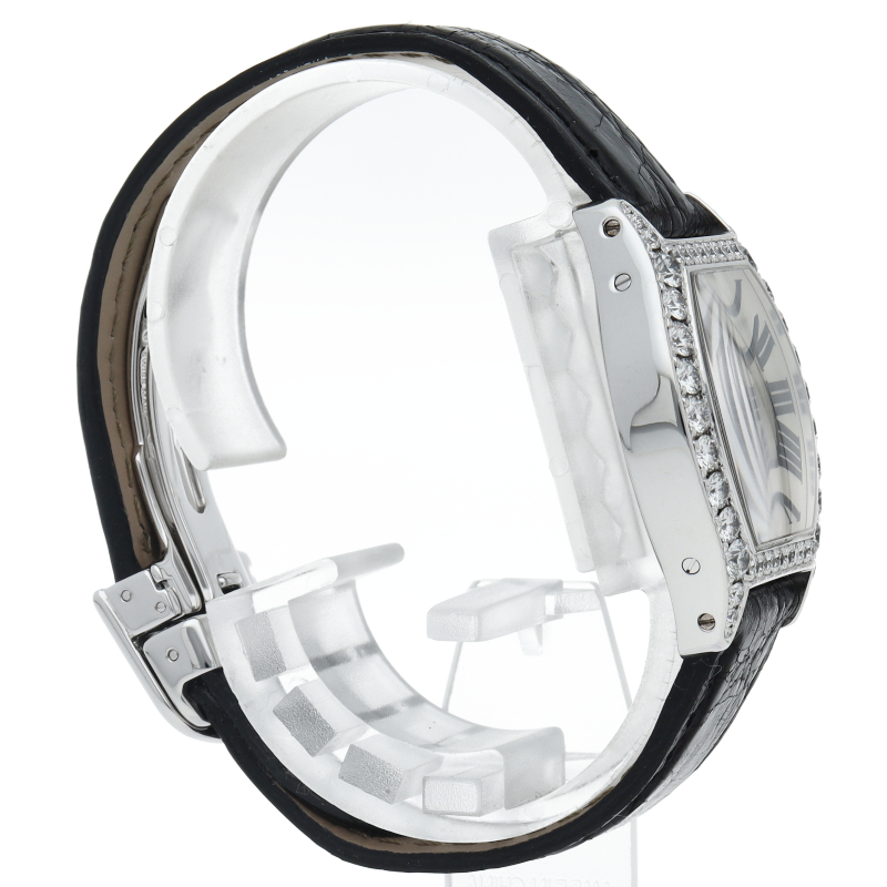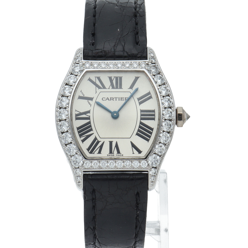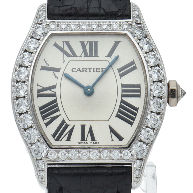 亀の甲羅をモチーフとした「トーチュ」。ホワイトゴールドケースに46個、リューズに1個(計1.75ct)のダイヤモンドをセッティングした豪華な腕時計です。また、ケースは裏スケルトンになっており、カルティエならではの意匠を施された美しい手巻きムーブメントを眺めることが可能です。