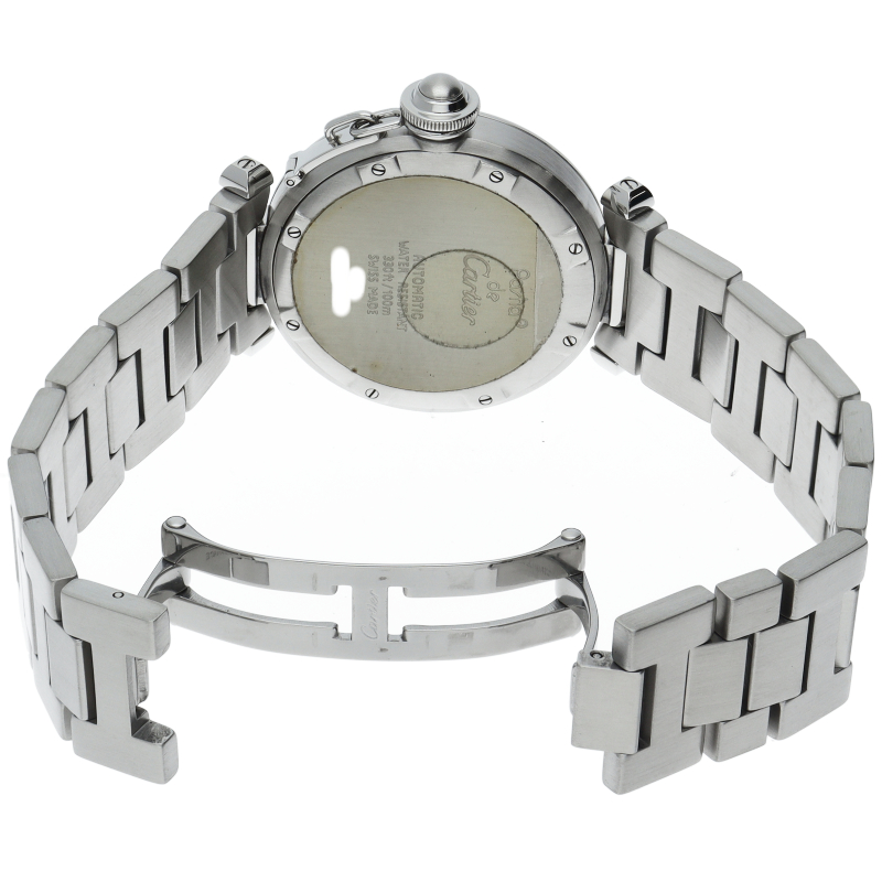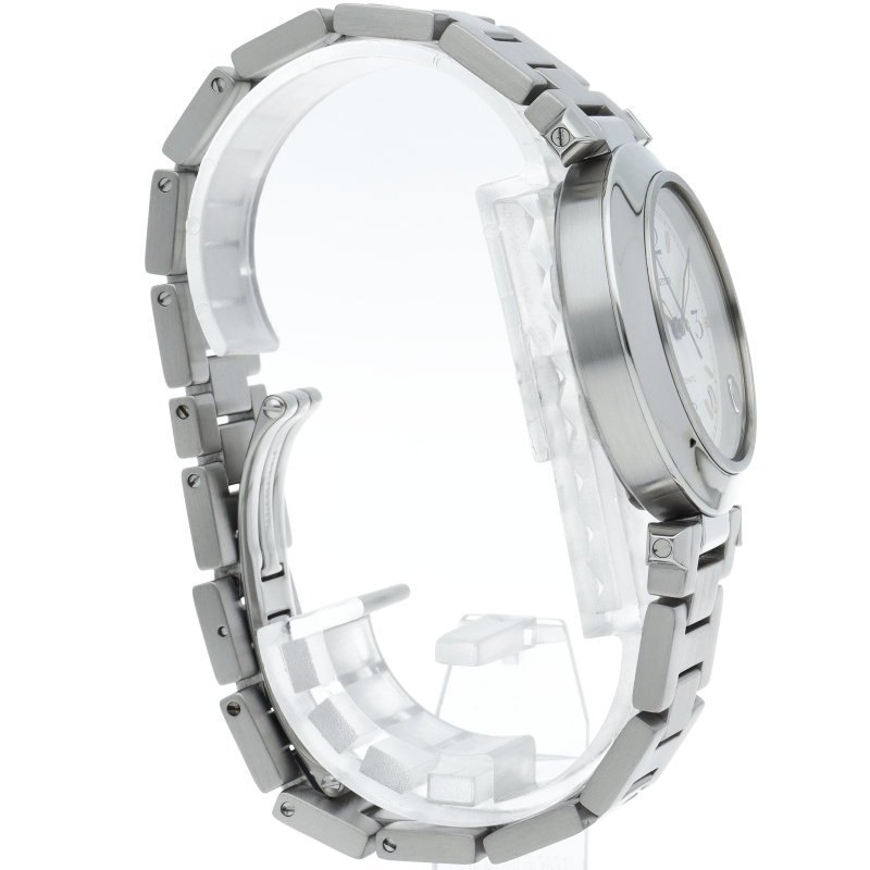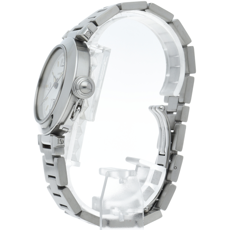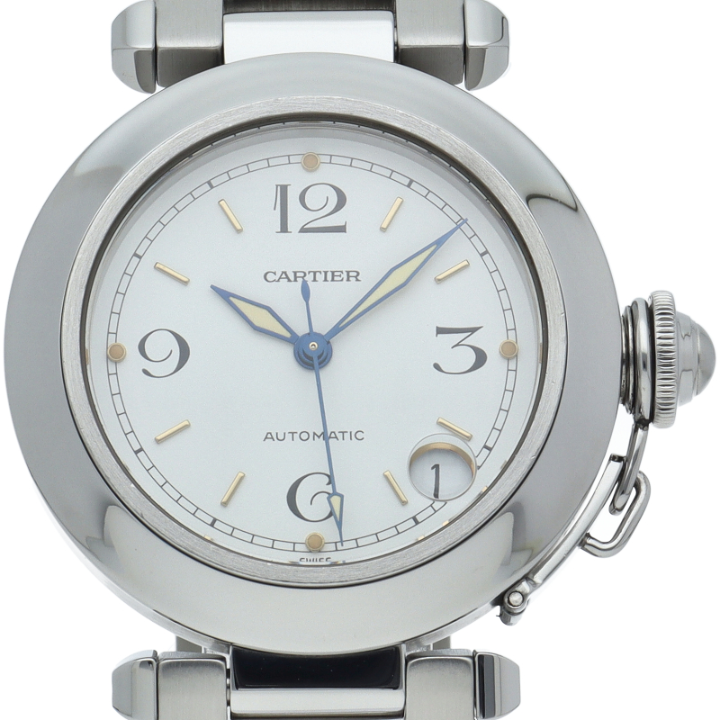 カルティエの人気パシャCシリーズ。4時と5時の間にデイト表示機能が付いた実用性のある1本。どんなシーンにも活用できるラウンドケースがオシャレです。