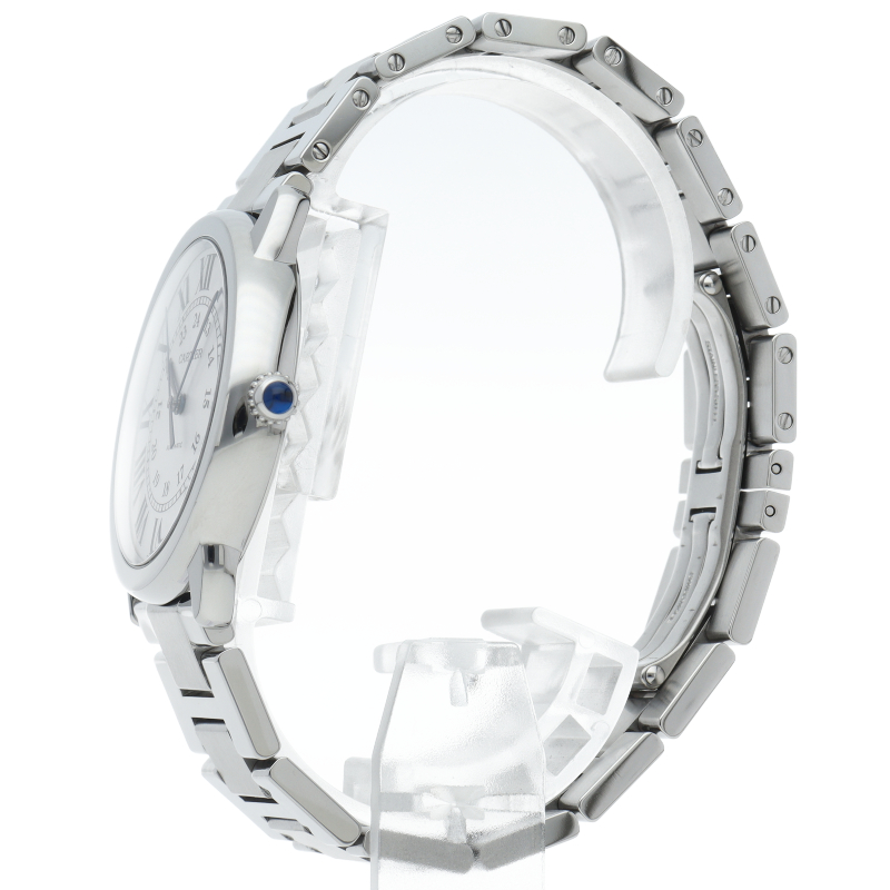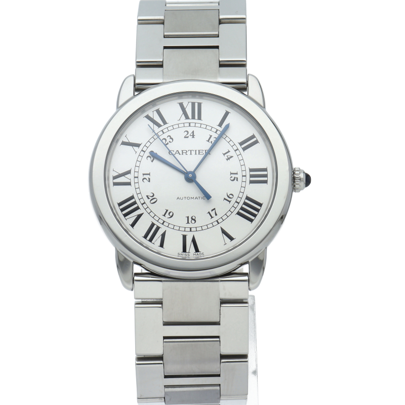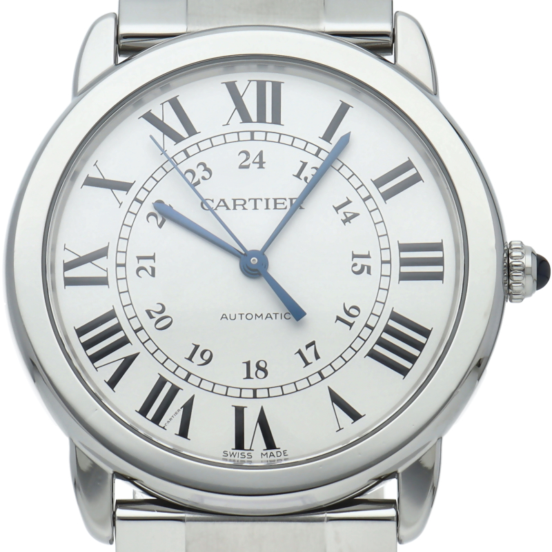 ベーシックなデザインで人気がある「ロンド ソロ」。シンプルな美しさのあるモデルですが、ブルースチールの針やローマンインデックスなどカルティエらしさも溢れたデザインです。