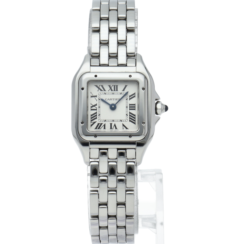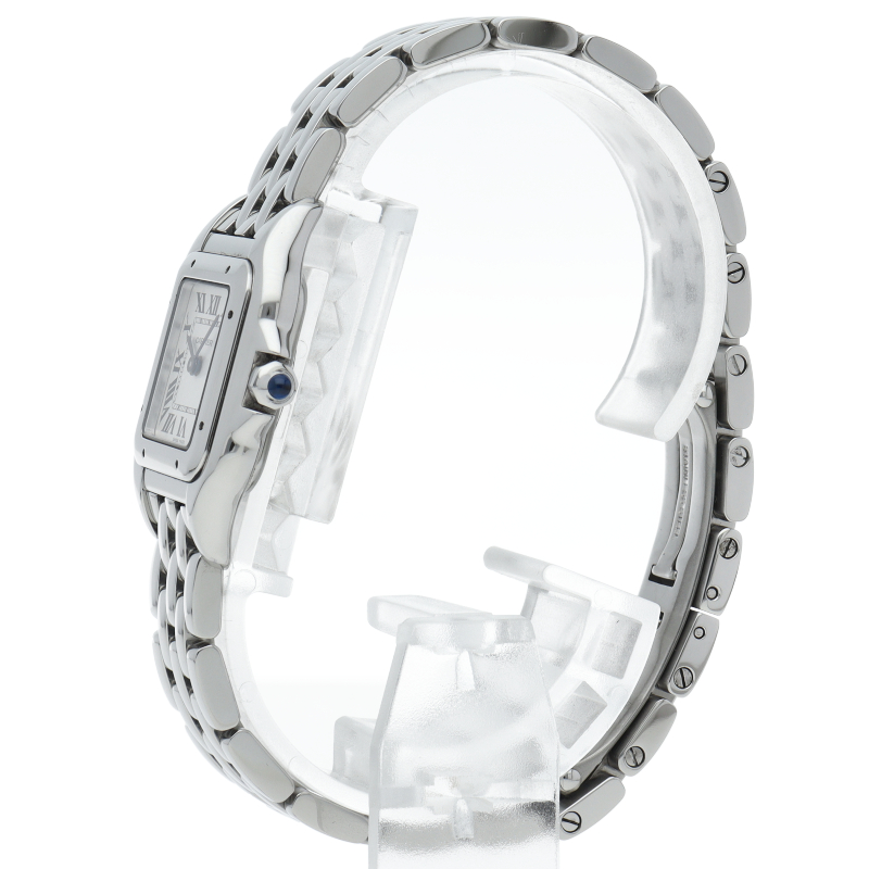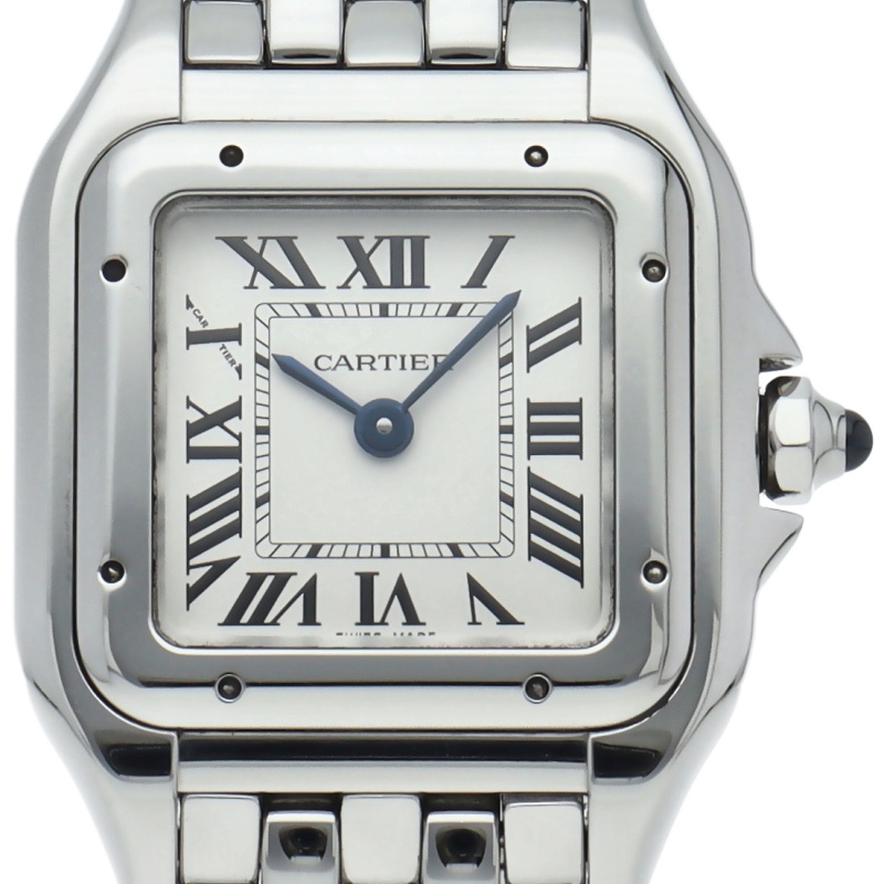 カルティエ「パンテール ドゥ カルティエ」SM(WSPN0006)。80年代のアイコンが現代的に蘇った復刻モデルです。抜群のフィット感を誇るしなやかなブレスレットは、まるでジュエリーのような着け心地。鏡面仕上げのステンレスとスクエアケースが洗練された輝きを放ち、女性の手元を優美に演出する永久定番です。