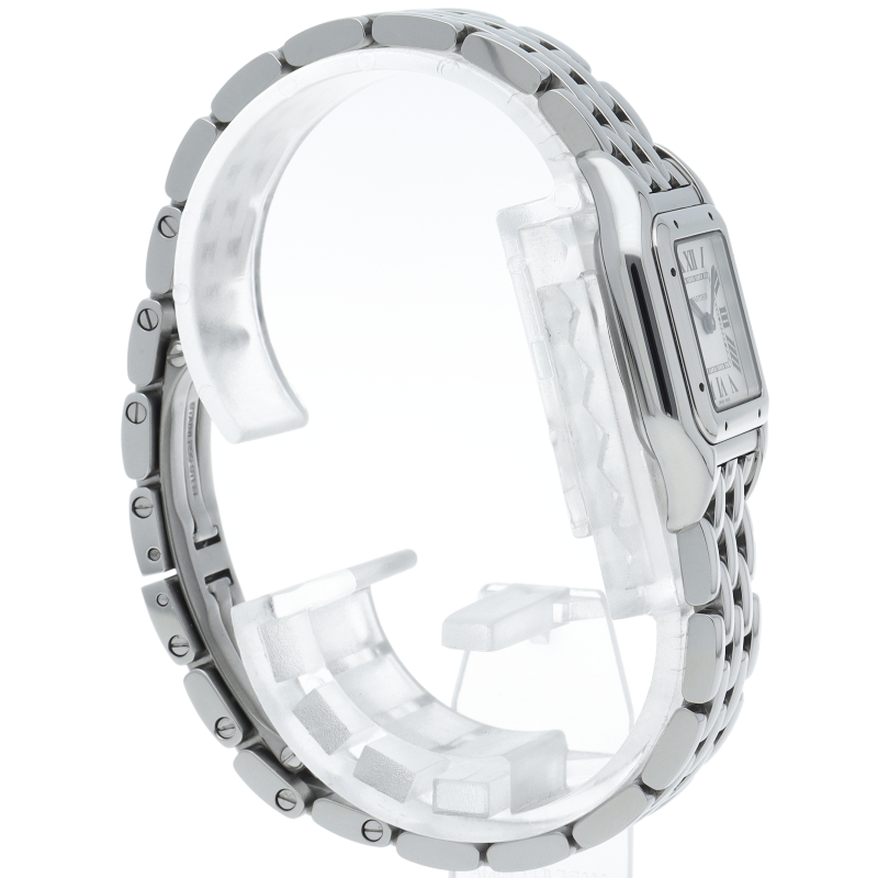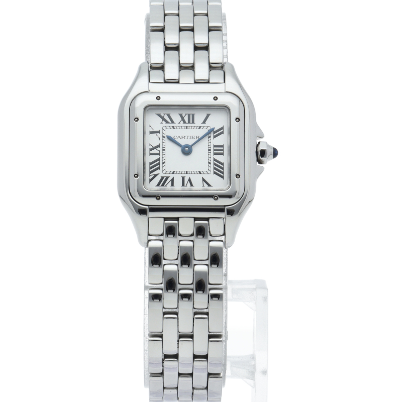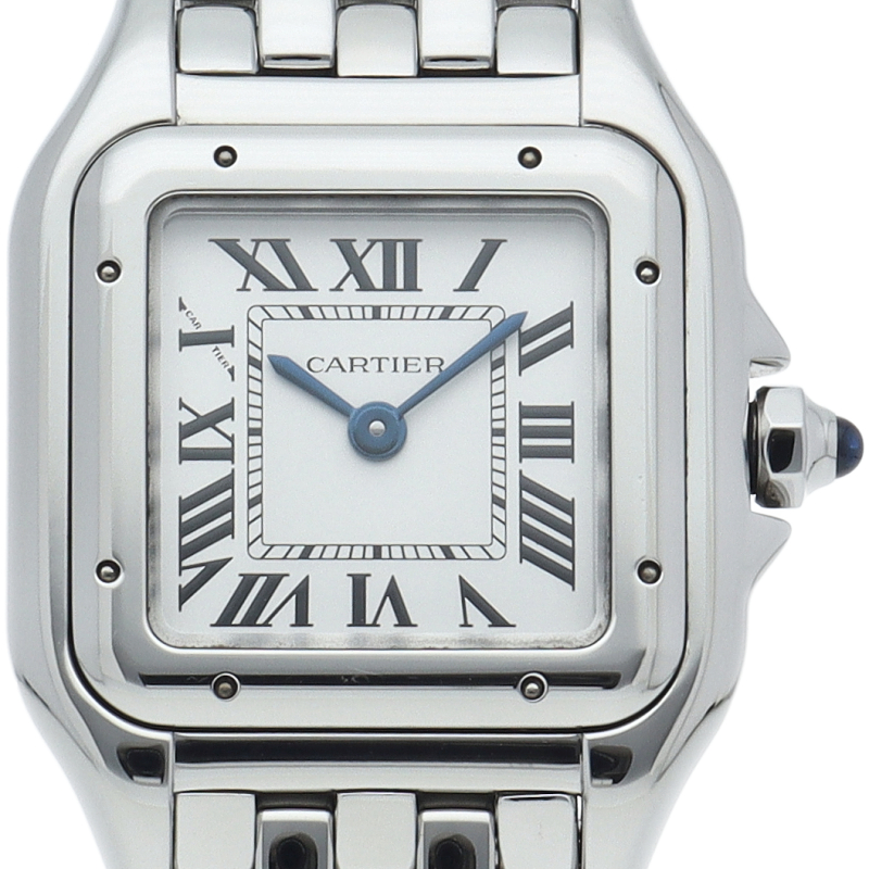 カルティエ「パンテール ドゥ カルティエ」SM(WSPN0006)。80年代のアイコンが現代的に蘇った復刻モデルです。抜群のフィット感を誇るしなやかなブレスレットは、まるでジュエリーのような着け心地。鏡面仕上げのステンレスとスクエアケースが洗練された輝きを放ち、女性の手元を優美に演出する永久定番です。