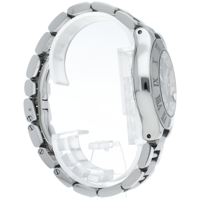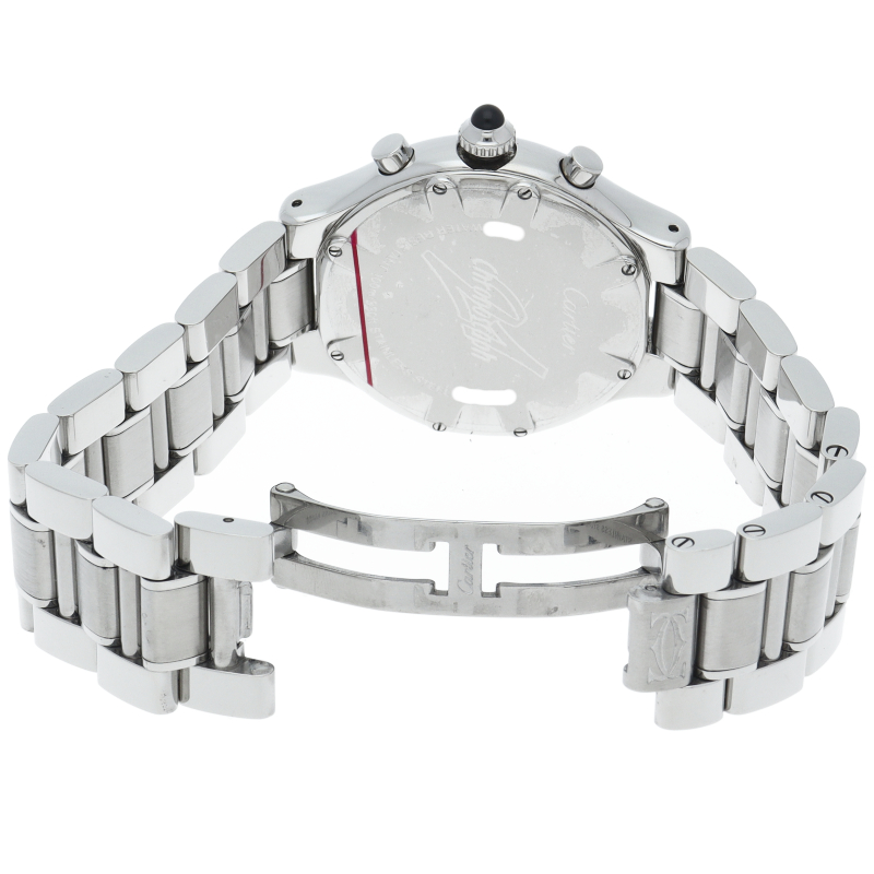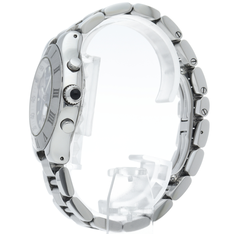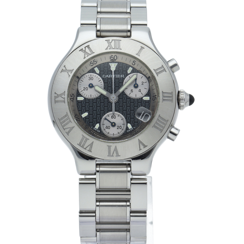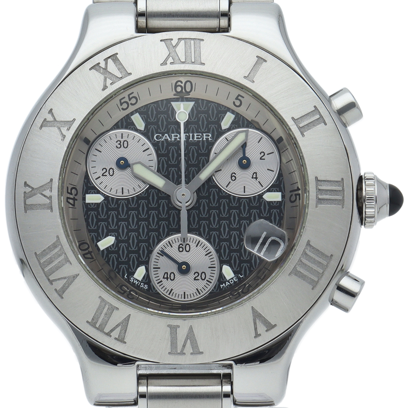 クロノグラフ、デイト表示機能を搭載したカルティエのスポーツウォッチ「クロノスカフ」。文字盤の2Cやベゼルを囲むローマ数字がオシャレな1本。