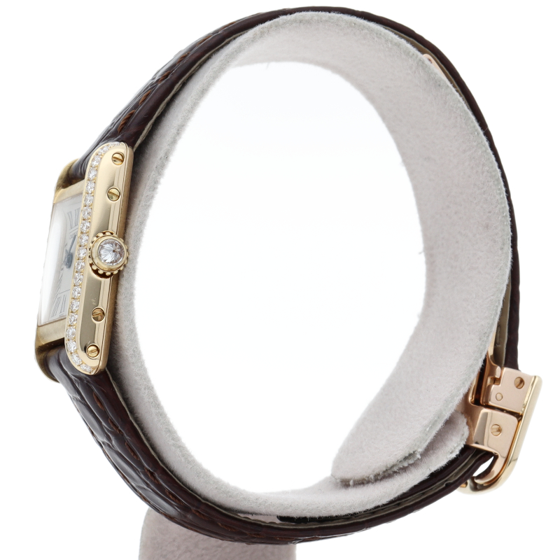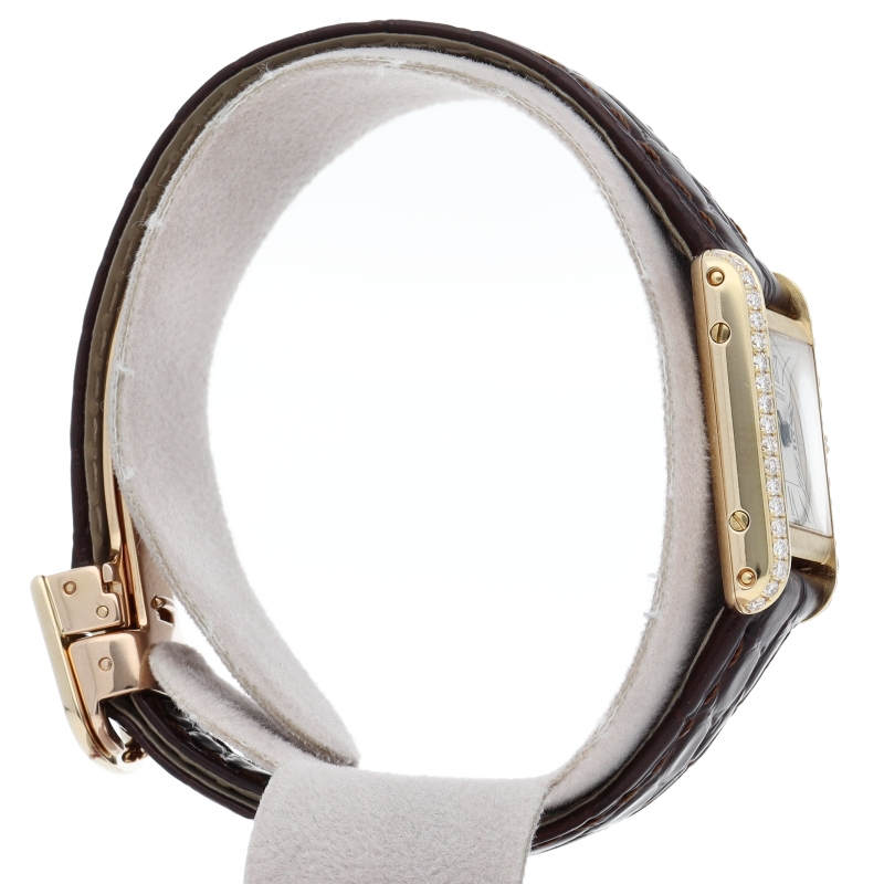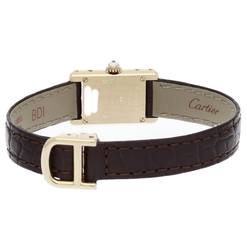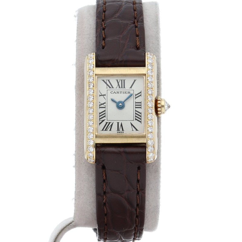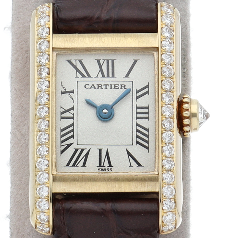 日常生活でも使いやすいモデルとして人気の高いタンクシリーズ。縦長のケースが特徴的な「タンク アメリカン」のミニサイズで、女性の腕にさりげなくフィットします。