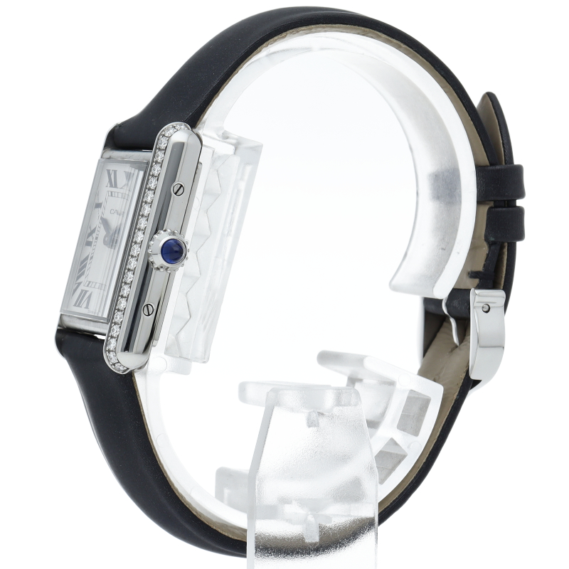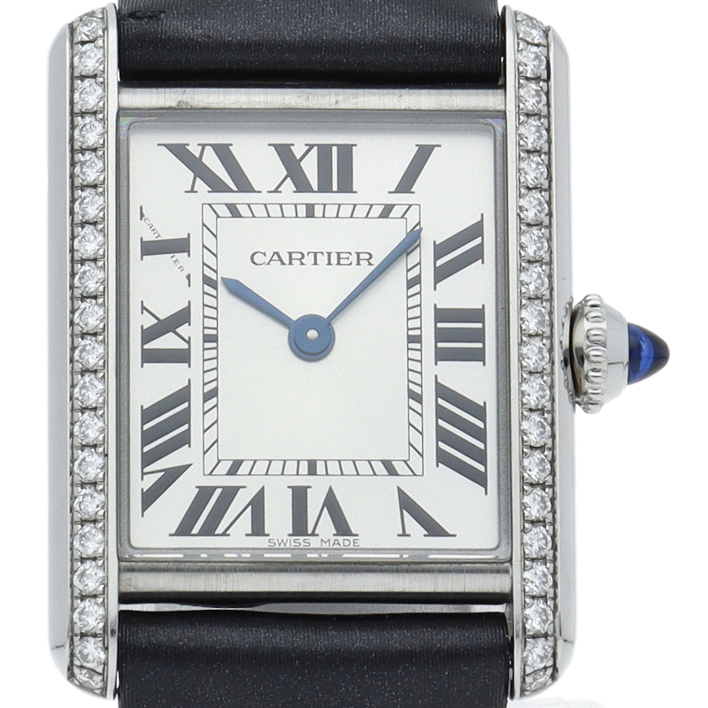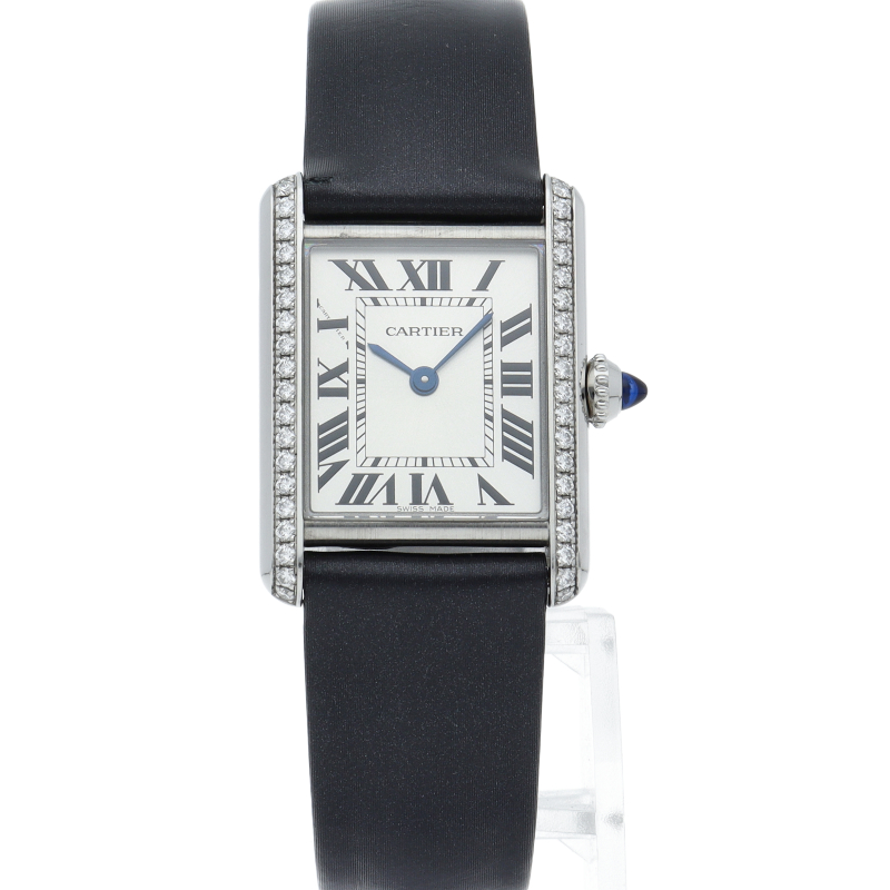 シャープな角を持つフラットなケースの縦枠の下アタッチメントとの接点を隠すというユニークなデザインがその美しさの秘密である「タンク マスト」。ケースサイドのダイヤモンドが非常に華やかで豪華な印象に仕上がっております。