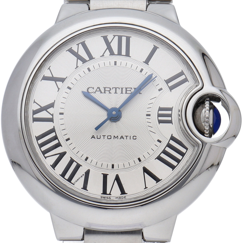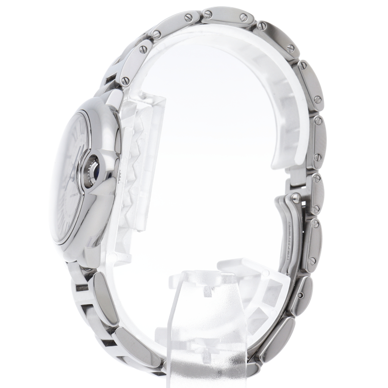 バロンブルーの名の通り風船のような綺麗な曲線が特徴的な人気モデル。深いブルーのリューズに沿って軌跡を描くローマ数字。凸レンズのようにふくらみを帯びたケース、ギョーシェ彫りを施したダイアル、剣型針、ポリッシュ仕上げのリンクス。“バロン ブルー ドゥ カルティエ”の魅力は風船のように漂い、カルティエ ウォッチの世界に多彩なニュアンスを添えます。