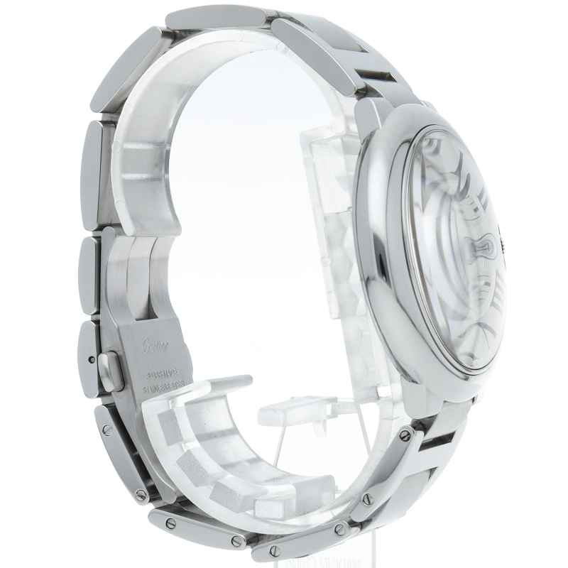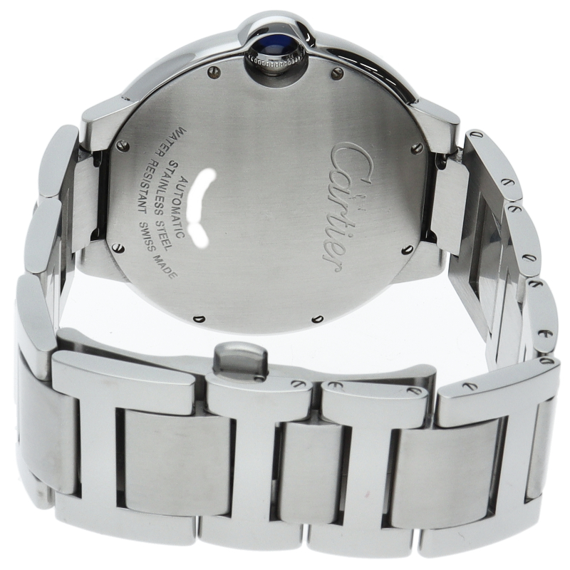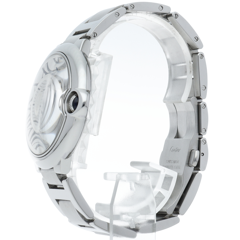 バロンブルーの名の通り風船のような綺麗な曲線が特徴的な人気モデル。深いブルーのリューズに沿って軌跡を描くローマ数字。凸レンズのようにふくらみを帯びたケース、ギョーシェ彫りを施したダイアル、剣型針、ポリッシュ仕上げのリンクス。“バロン ブルー ドゥ カルティエ”の魅力は風船のように漂い、カルティエ ウォッチの世界に多彩なニュアンスを添えます。