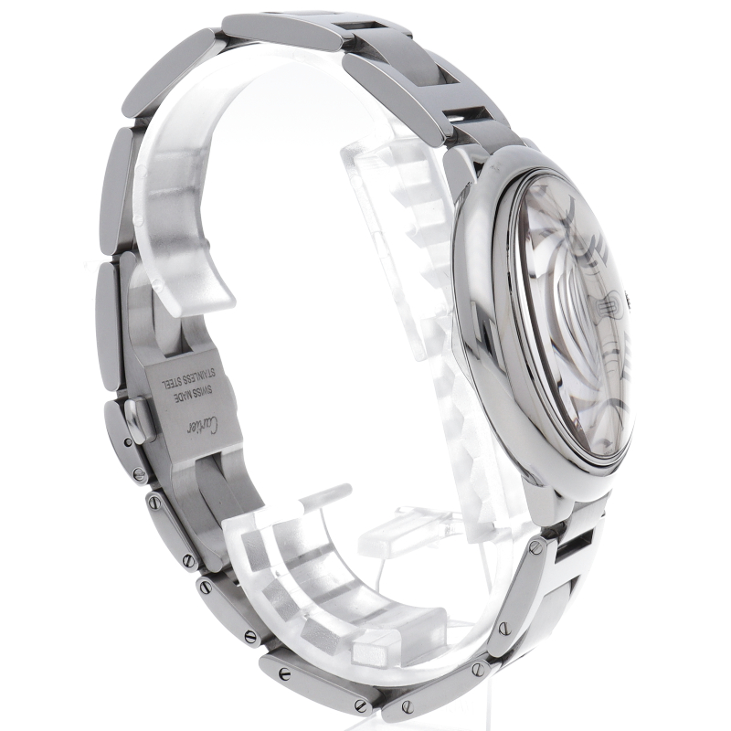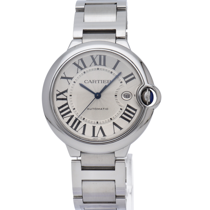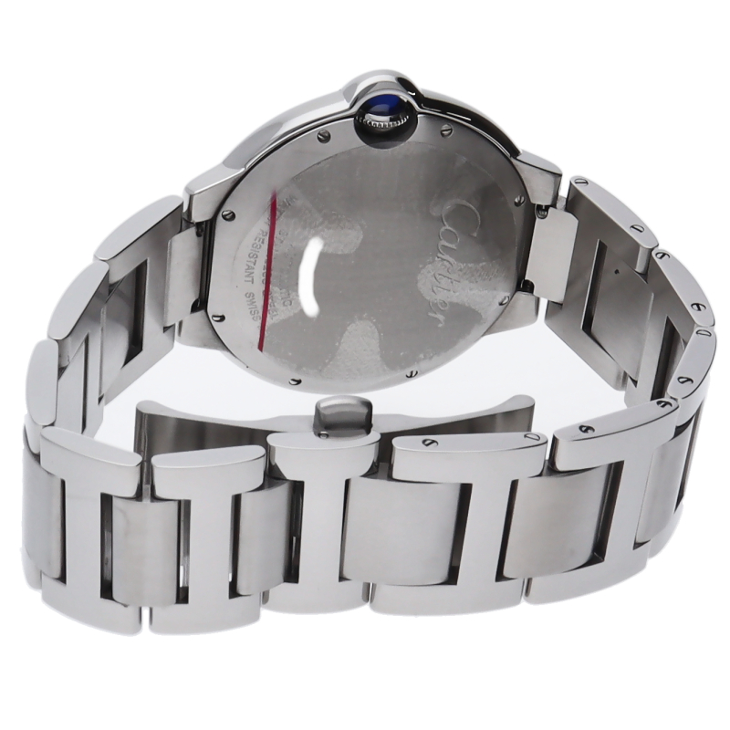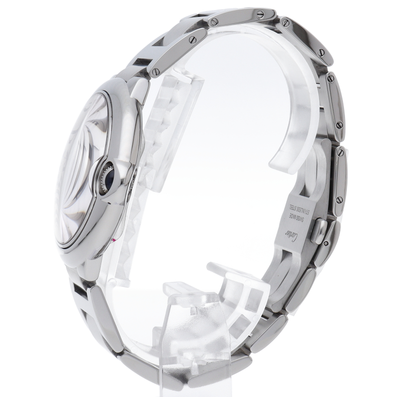 バロンブルーの名の通り風船のような綺麗な曲線が特徴的な人気モデル。深いブルーのリューズに沿って軌跡を描くローマ数字。凸レンズのようにふくらみを帯びたケース、ギョーシェ彫りを施したダイアル、剣型針、ポリッシュ仕上げのリンクス。“バロン ブルー ドゥ カルティエ”の魅力は風船のように漂い、カルティエ ウォッチの世界に多彩なニュアンスを添えます。