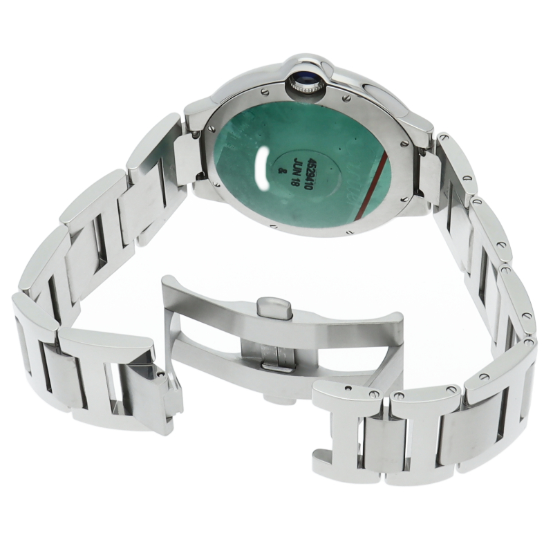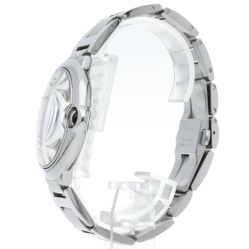 バロンブルーの名の通り風船のような綺麗な曲線が特徴的な人気モデル。深いブルーのリューズに沿って軌跡を描くローマ数字。凸レンズのようにふくらみを帯びたケース、ギョーシェ彫りを施したダイアル、剣型針、ポリッシュ仕上げのリンクス。“バロン ブルー ドゥ カルティエ”の魅力は風船のように漂い、カルティエ ウォッチの世界に多彩なニュアンスを添えます。