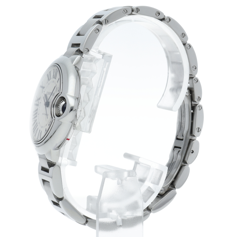 バロンブルーの名の通り風船のような綺麗な曲線が特徴的な人気モデル。深いブルーのリューズに沿って軌跡を描くローマ数字。凸レンズのようにふくらみを帯びたケース、ギョーシェ彫りを施したダイアル、剣型針、ポリッシュ仕上げのリンクス。“バロン ブルー ドゥ カルティエ”の魅力は風船のように漂い、カルティエ ウォッチの世界に多彩なニュアンスを添えます。