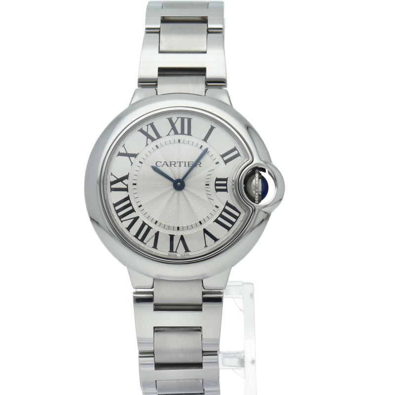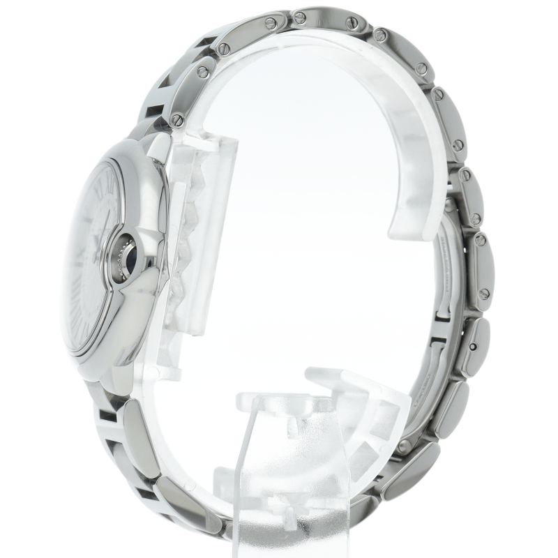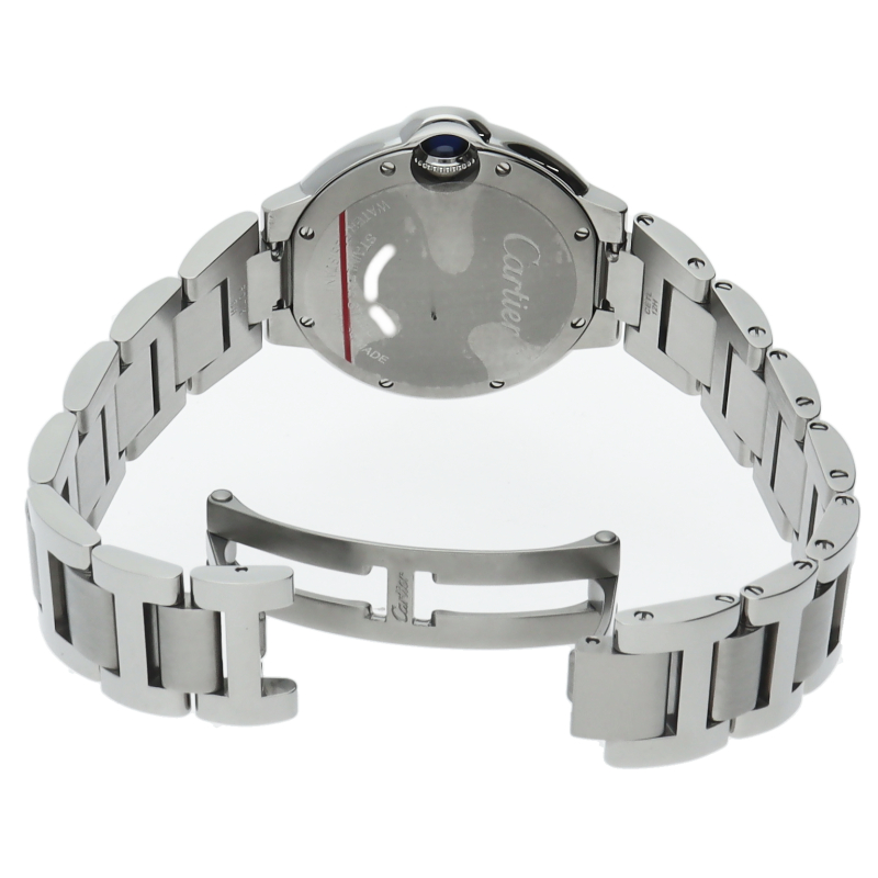 バロンブルーの名の通り風船のような綺麗な曲線が特徴的な人気モデル。深いブルーのリューズに沿って軌跡を描くローマ数字。凸レンズのようにふくらみを帯びたケース、ギョーシェ彫りを施したダイアル、剣型針、ポリッシュ仕上げのリンクス。“バロン ブルー ドゥ カルティエ”の魅力は風船のように漂い、カルティエ ウォッチの世界に多彩なニュアンスを添えます。