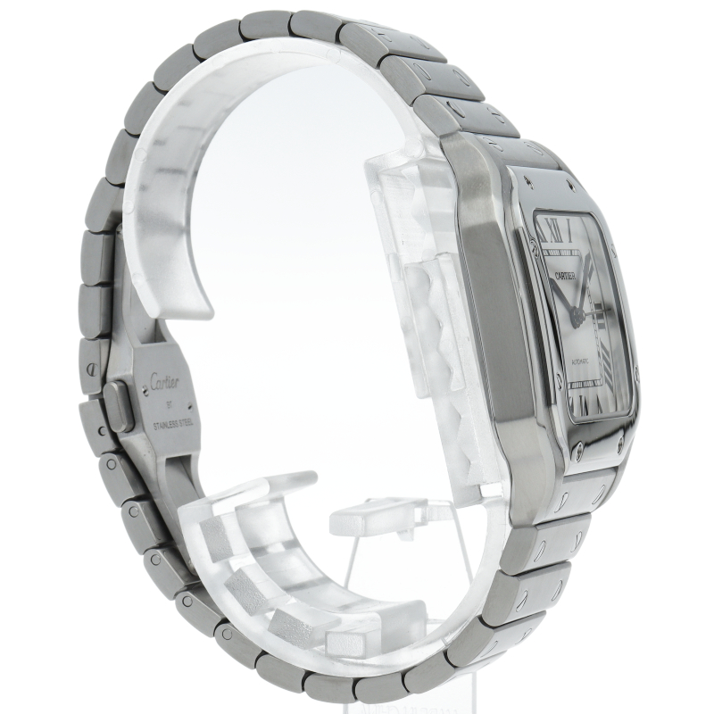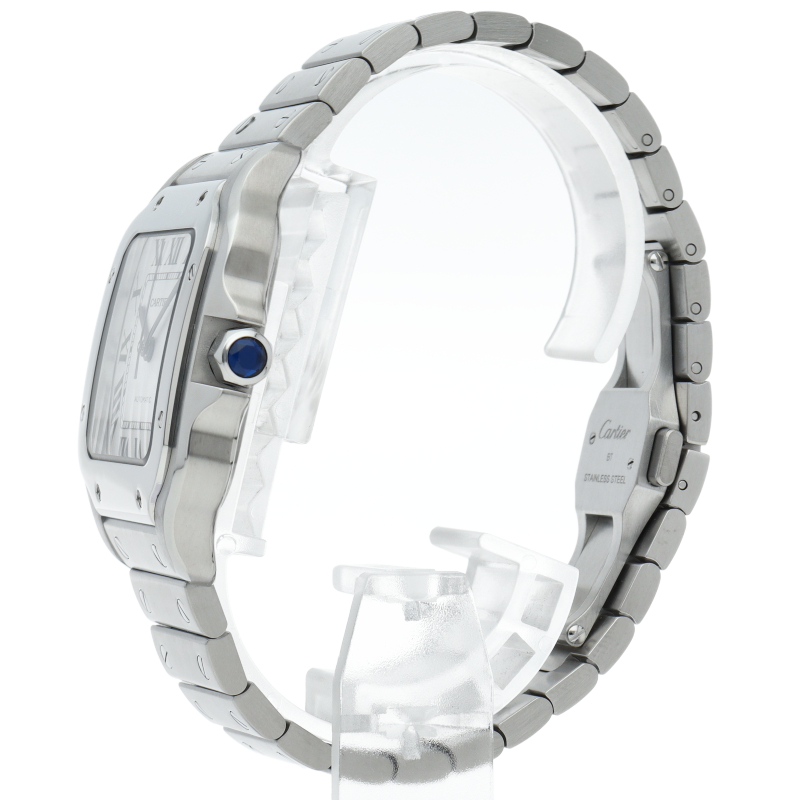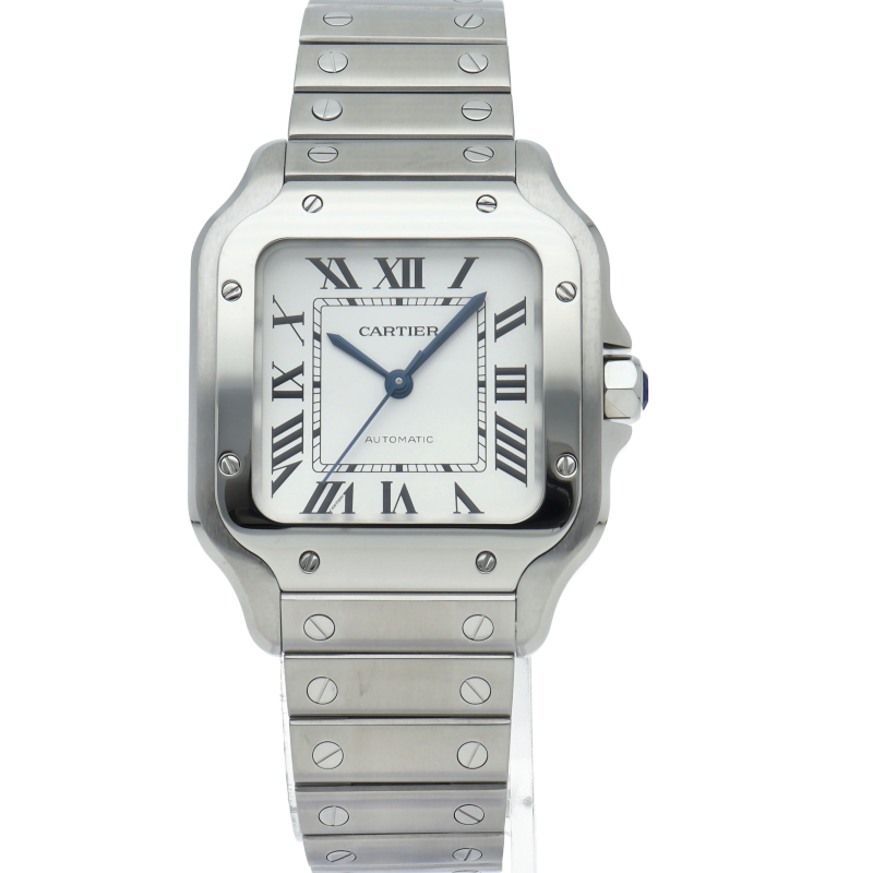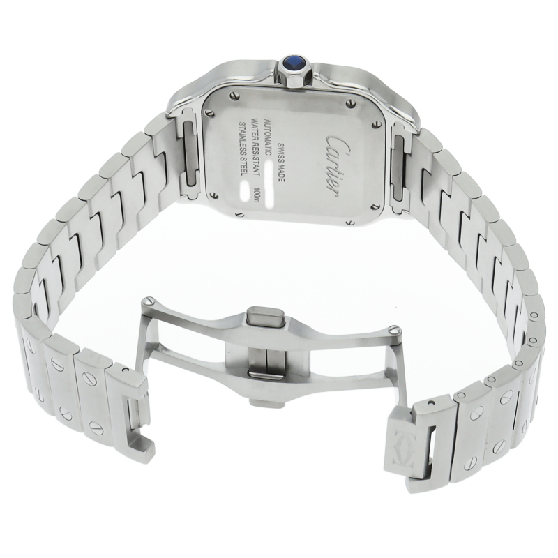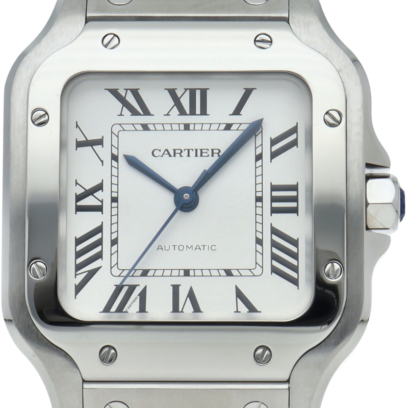 ムーブメントには自社製自動巻きキャリバー1847MCを搭載します。文字盤のローマインデックスとその内側に描かれた四角のレイルウェイ分目盛はカルティエウォッチを特徴づけ、またケースとブレスレットにはサントスウォッチ特有のビスモチーフが施されています。