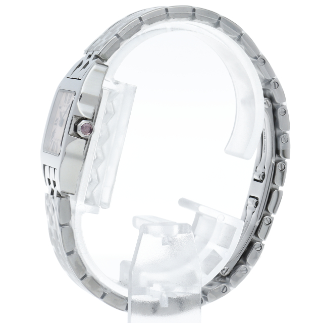 5連ブレスがしなやかで小ぶりキュートなカルティエらしいウォッチです。ピンクシェル文字盤にブルーの指針が美しく小ぶりながら見やすいインデックスとともに時を進めます。リューズのピンクスピネルがラグジュアリーなアクセントになっています。