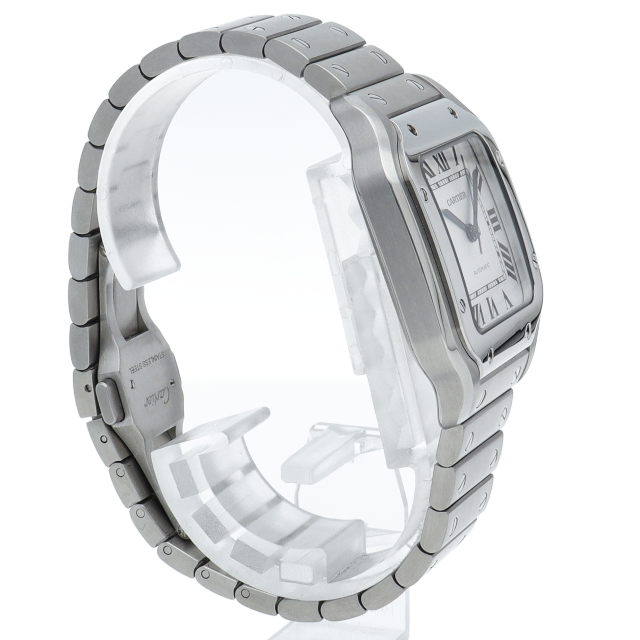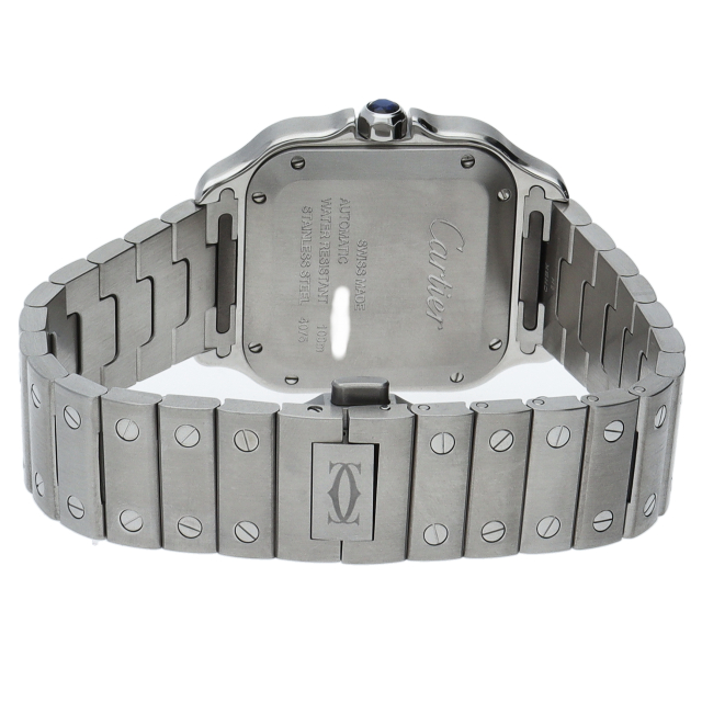 ムーブメントには自社製自動巻きキャリバー1847MCを搭載します。文字盤のローマインデックスとその内側に描かれた四角のレイルウェイ分目盛はカルティエウォッチを特徴づけ、またケースとブレスレットにはサントスウォッチ特有のビスモチーフが施されています。