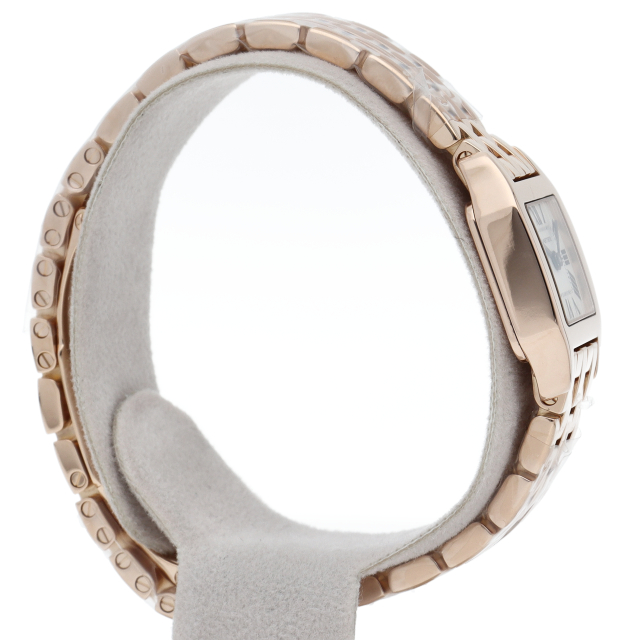 5連ブレスがしなやかで小ぶりキュートなカルティエらしいウォッチです。ホワイト文字盤にブルーの指針が美しく小ぶりながら見やすいインデックスとともに時を進めます。リューズのブルースピネルがラグジュアリーなアクセントになっています。