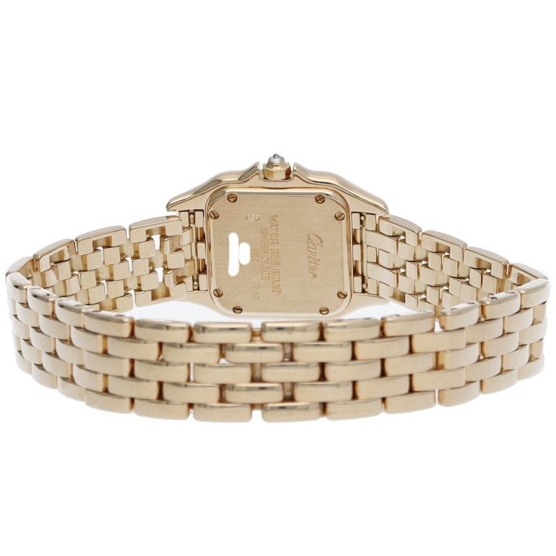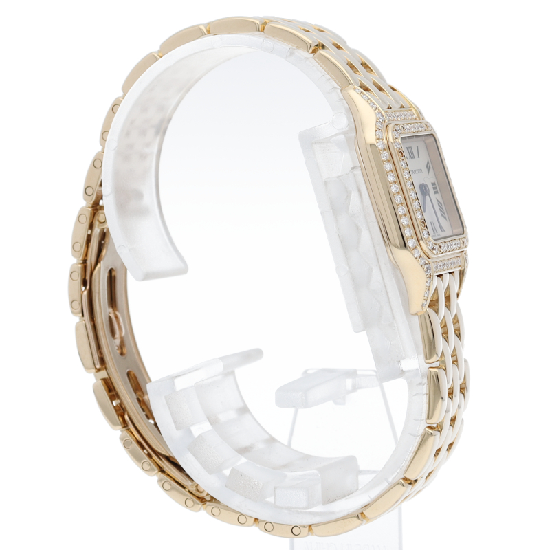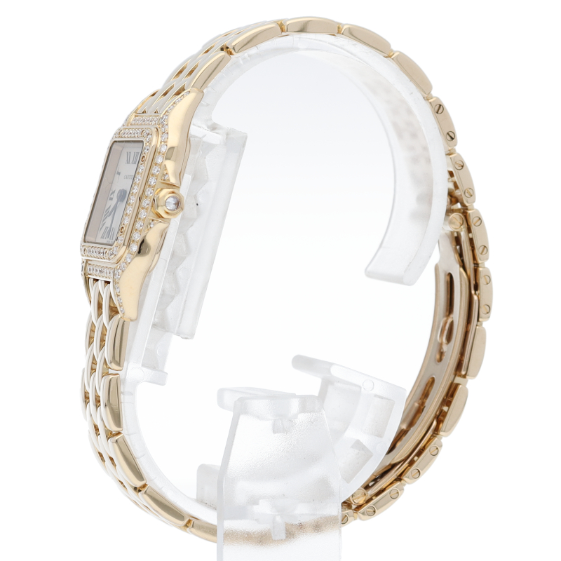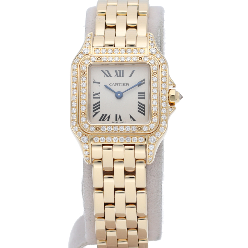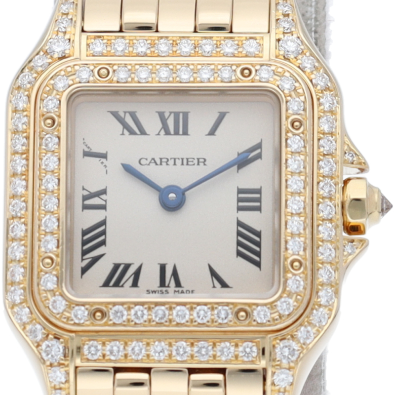 多くの女性を虜にし根強い人気を誇る”パンテール”。ゴージャスな雰囲気のあるイエローゴールド素材を使用し、ケース正面とベゼルにダイヤモンドをセッティングした人気の高いモデルです。