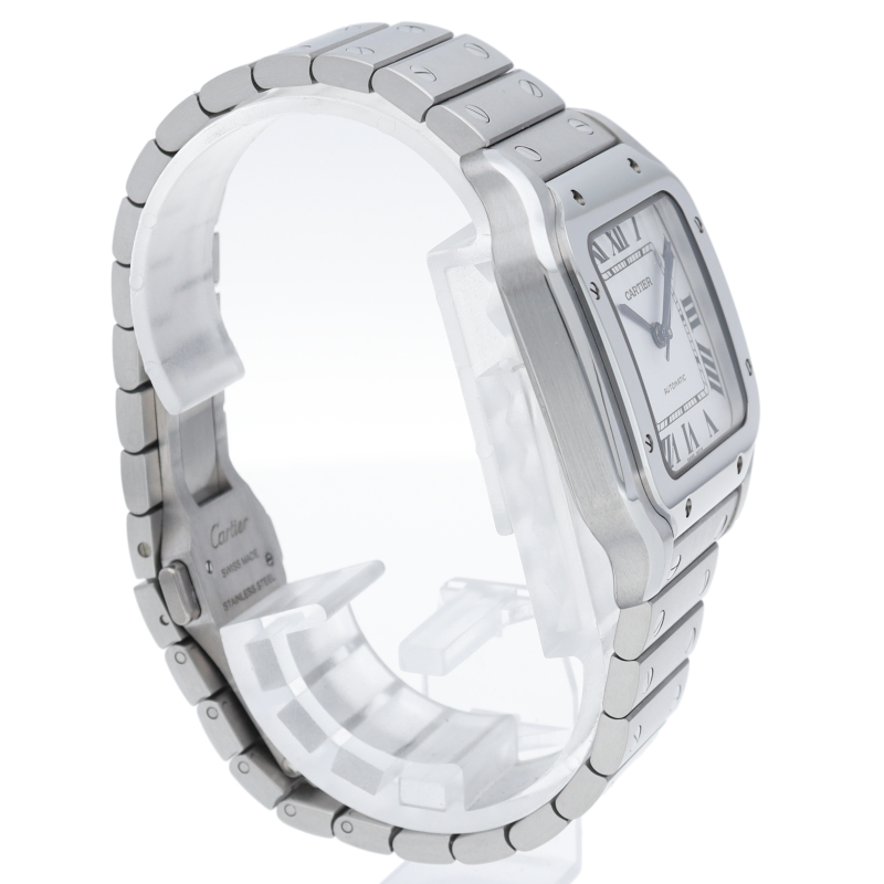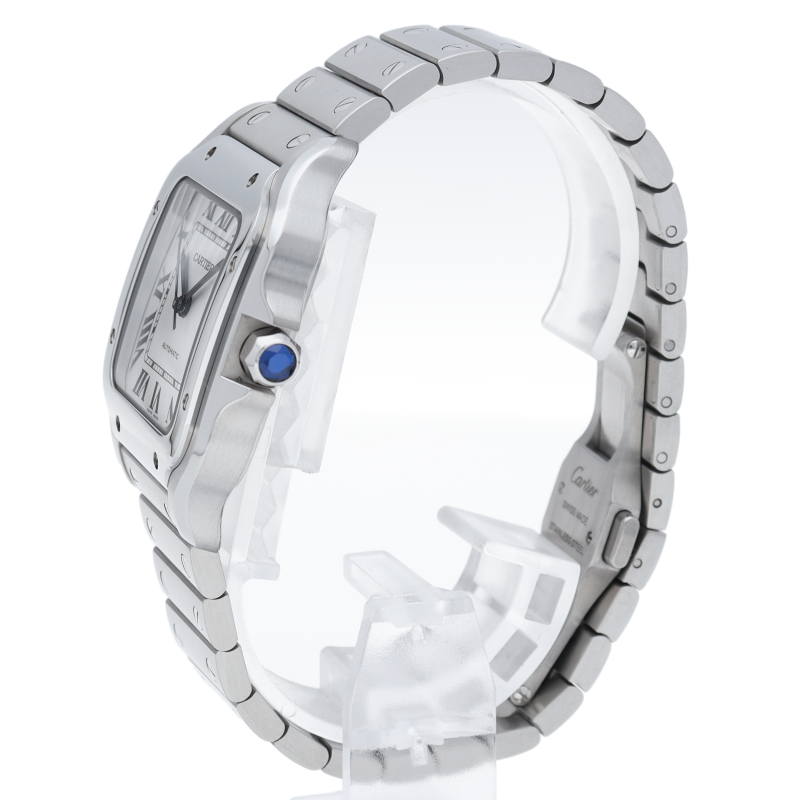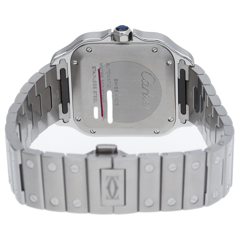 ムーブメントには自社製自動巻きキャリバー1847MCを搭載します。文字盤のローマインデックスとその内側に描かれた四角のレイルウェイ分目盛はカルティエウォッチを特徴づけ、またケースとブレスレットにはサントスウォッチ特有のビスモチーフが施されています。