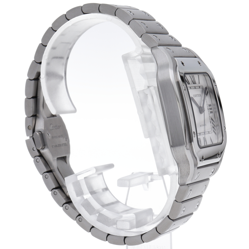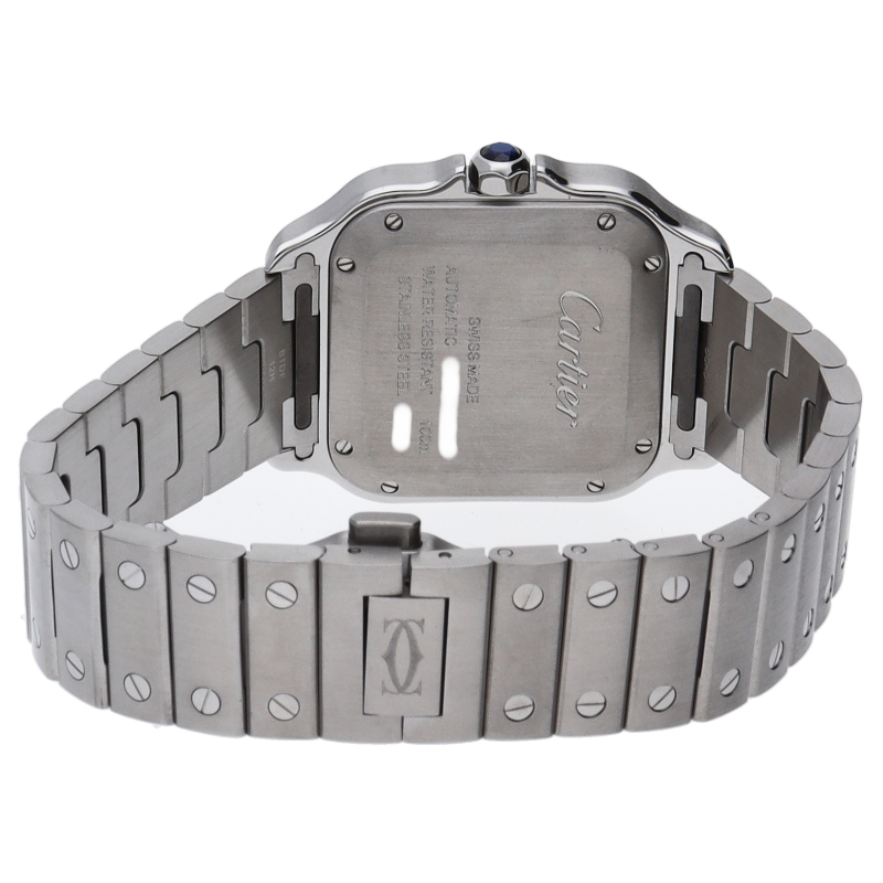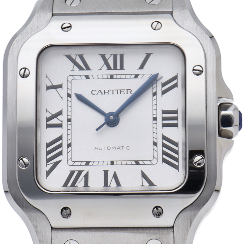 ムーブメントには自社製自動巻きキャリバー1847MCを搭載します。文字盤のローマインデックスとその内側に描かれた四角のレイルウェイ分目盛はカルティエウォッチを特徴づけ、またケースとブレスレットにはサントスウォッチ特有のビスモチーフが施されています。