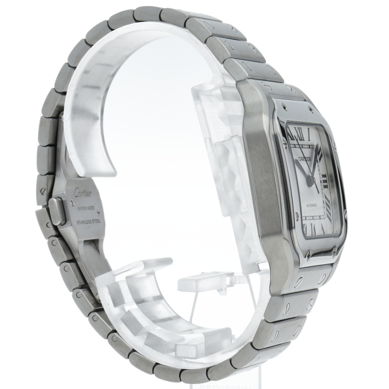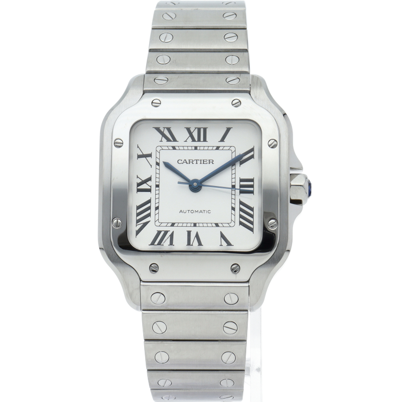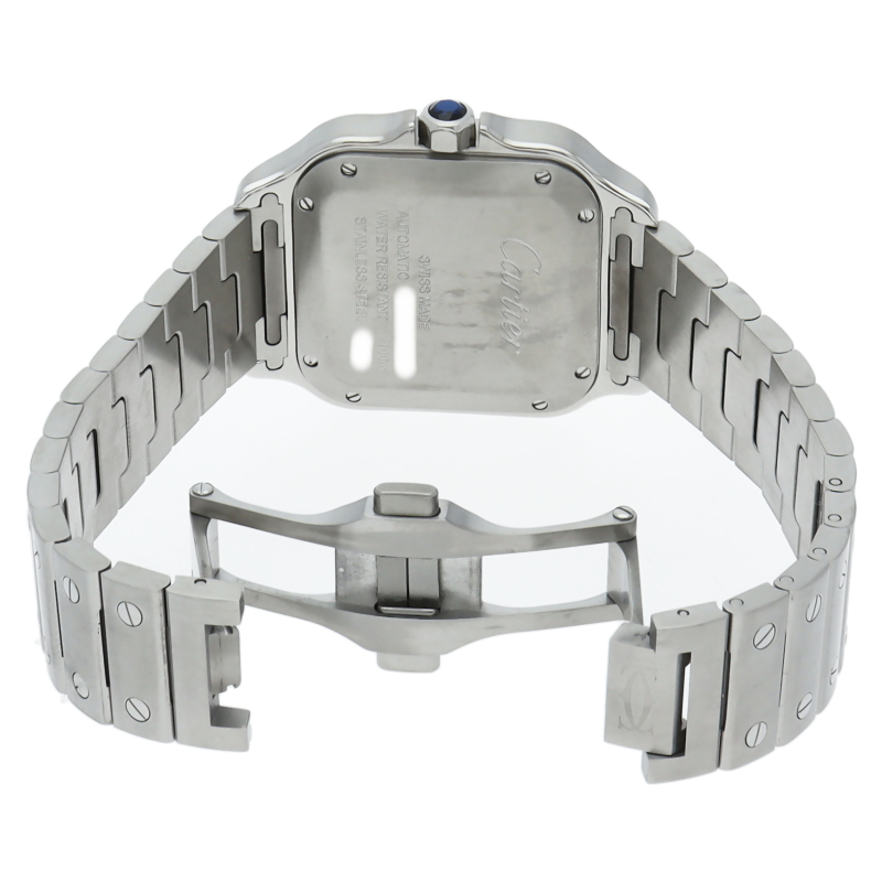 ムーブメントには自社製自動巻きキャリバー1847MCを搭載します。文字盤のローマインデックスとその内側に描かれた四角のレイルウェイ分目盛はカルティエウォッチを特徴づけ、またケースとブレスレットにはサントスウォッチ特有のビスモチーフが施されています。