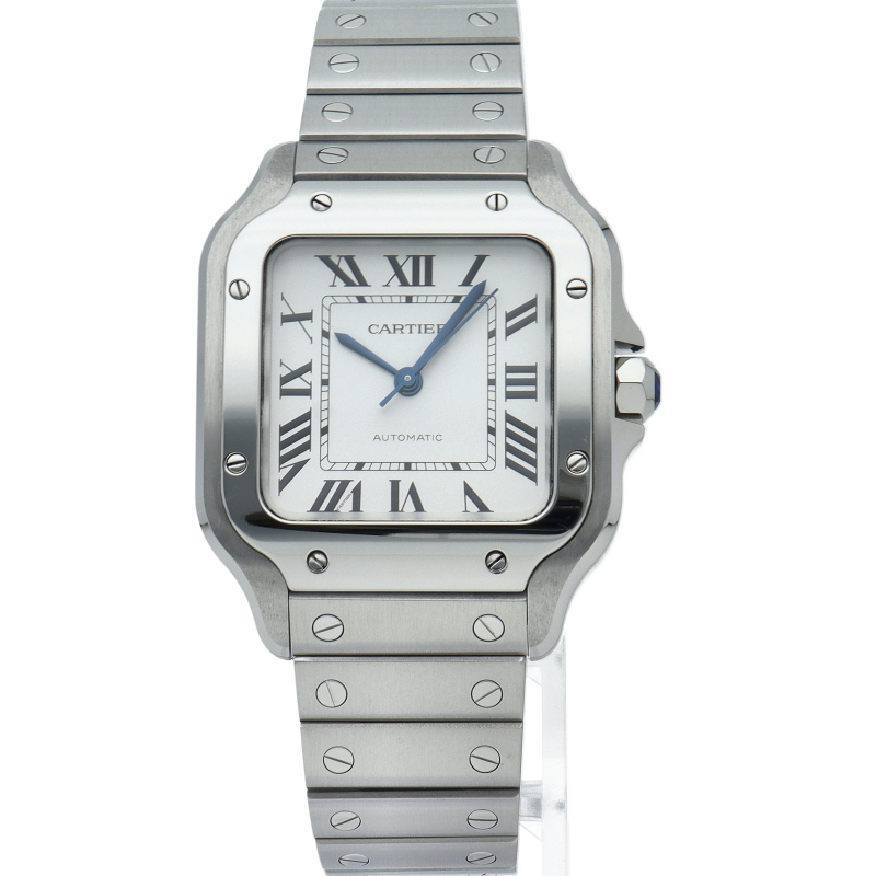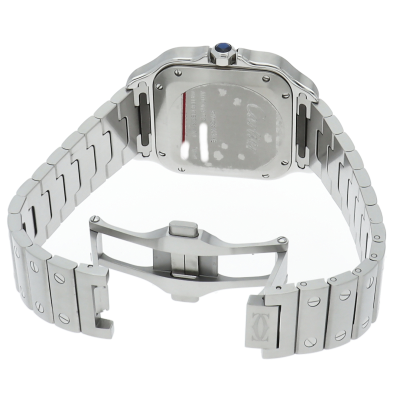 ムーブメントには自社製自動巻きキャリバー1847MCを搭載します。文字盤のローマインデックスとその内側に描かれた四角のレイルウェイ分目盛はカルティエウォッチを特徴づけ、またケースとブレスレットにはサントスウォッチ特有のビスモチーフが施されています。