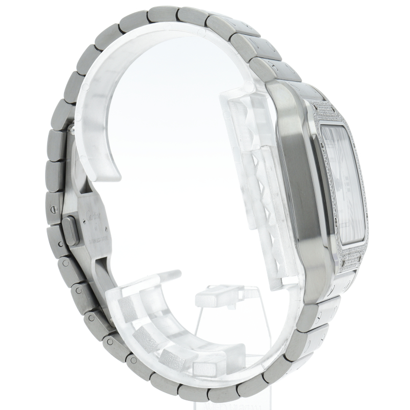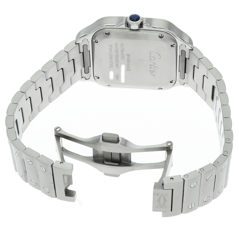 ムーブメントには自社製自動巻きキャリバー1847MCを搭載します。文字盤のローマインデックスとその内側に描かれた四角のレイルウェイ分目盛はカルティエウォッチを特徴づけ、またケースとブレスレットにはサントスウォッチ特有のビスモチーフが施されています。
