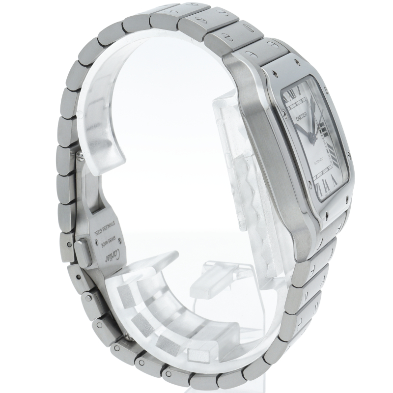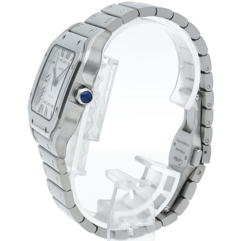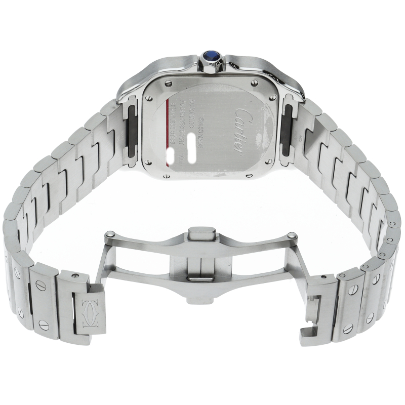 ムーブメントには自社製自動巻きキャリバー1847MCを搭載します。文字盤のローマインデックスとその内側に描かれた四角のレイルウェイ分目盛はカルティエウォッチを特徴づけ、またケースとブレスレットにはサントスウォッチ特有のビスモチーフが施されています。