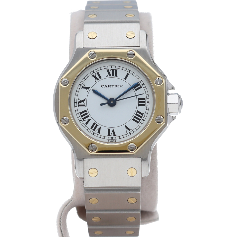 サントスオクタゴンは現行モデルには無い8角形(オクタゴン)ケースとサントスのモチーフである「ビス」がベゼルとブレスレットに打ちつけられているのが特徴的で、生産終了後も人気のモデルです。シャープでクラシカルな印象を与える個性派向けのモデル。