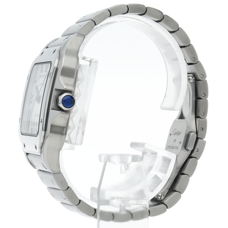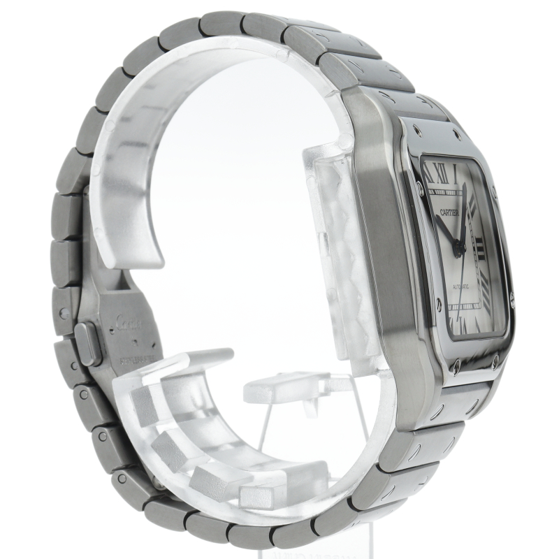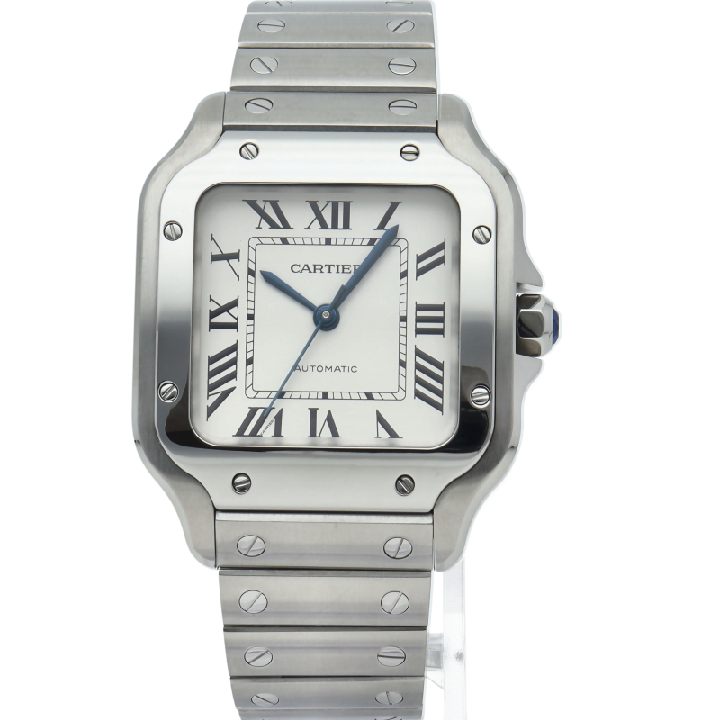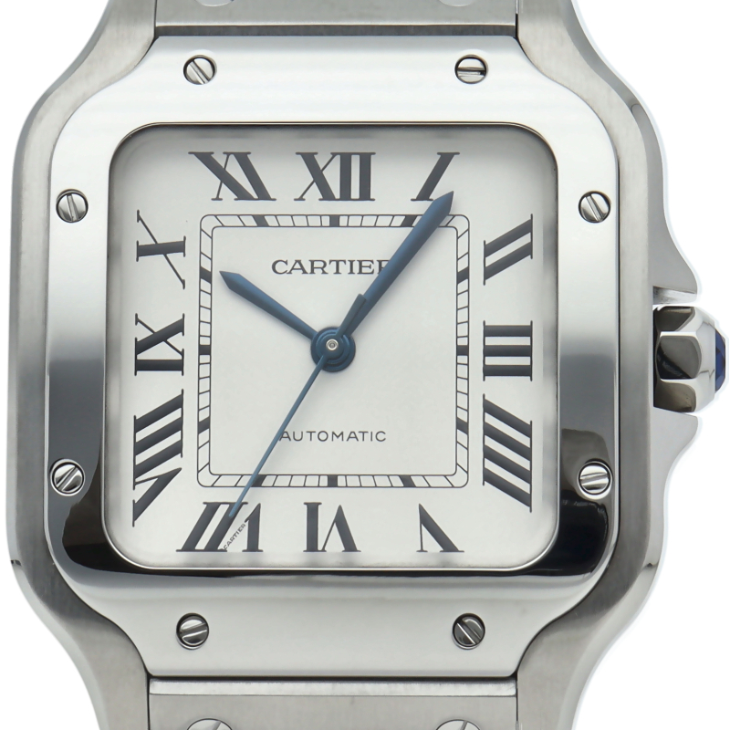 ムーブメントには自社製自動巻きキャリバー1847MCを搭載します。文字盤のローマインデックスとその内側に描かれた四角のレイルウェイ分目盛はカルティエウォッチを特徴づけ、またケースとブレスレットにはサントスウォッチ特有のビスモチーフが施されています。