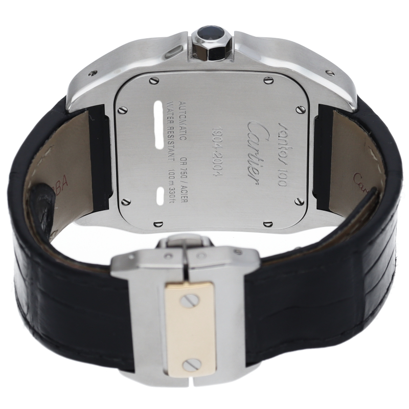 サントス100周年記念に誕生した「サントス100」シリーズ。ボリューム感あるデザインながら上品な作りが人気の1本です。男性に人気のLMサイズ。ワンランク上のコンビ仕様。初期型限定の裏蓋に「1904-2004」の刻印が彫られています。