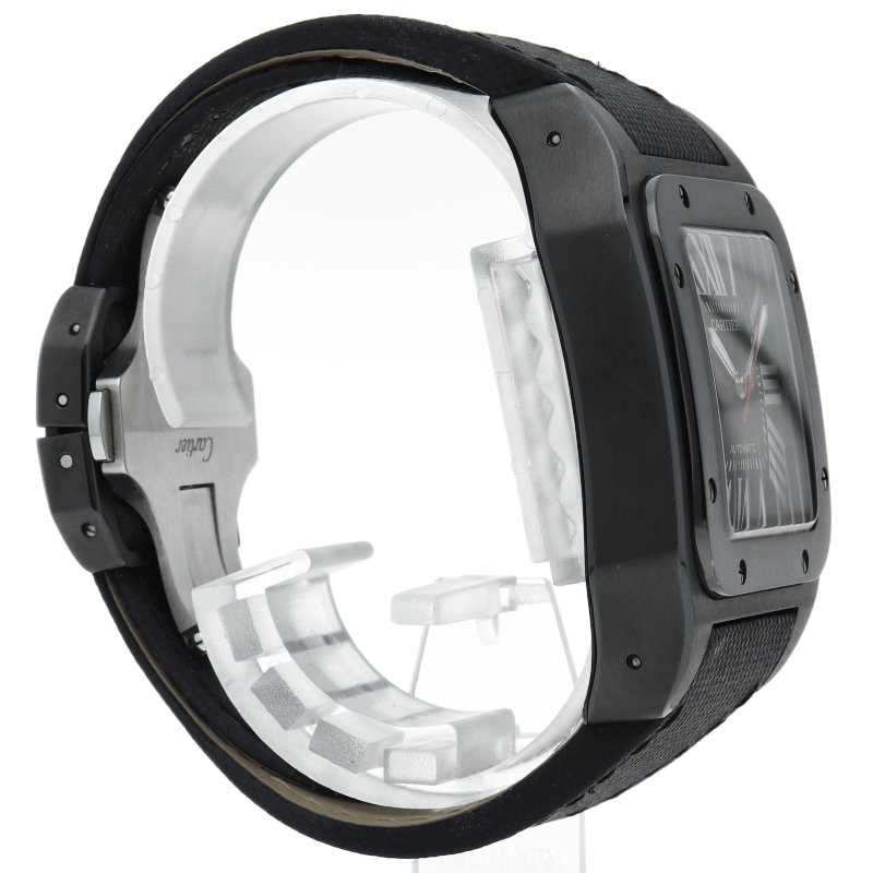 スクエアのケースが特徴的なサントス100。ブラックの高硬度ADLC加工(カーボンコーティング)が施されたスティールケースにブラック文字盤と、全体がブラックと重厚感を出していてスタイリッシュな印象です。