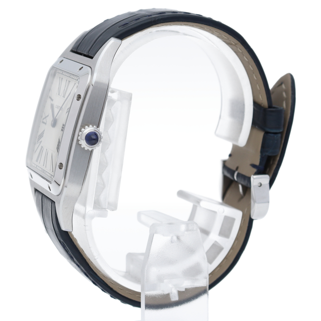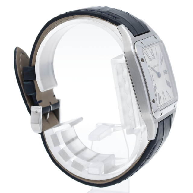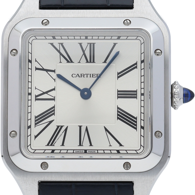 1904年、ルイ・カルティエが、友人で有名なブラジル人飛行士のアルベルト・サントス・デュモンの飛行中に時刻を確認したいという願いを聞いて製作されたのが「サントスウォッチ」です。こちらはデュモンの特徴ともいえる薄型ケースをクォーツムーブメントを搭載することで可能としたケース径31.4mmのメンズモデルです。