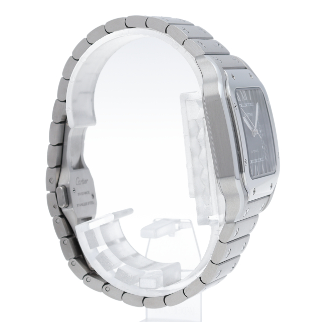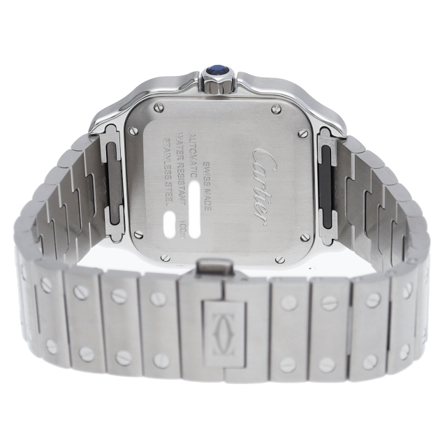 ムーブメントには自社製自動巻きキャリバー1847MCを搭載します。文字盤のローマインデックスとその内側に描かれた四角のレイルウェイ分目盛はカルティエウォッチを特徴づけ、またケースとブレスレットにはサントスウォッチ特有のビスモチーフが施されています。