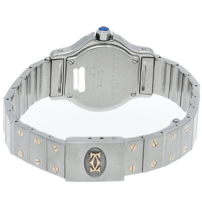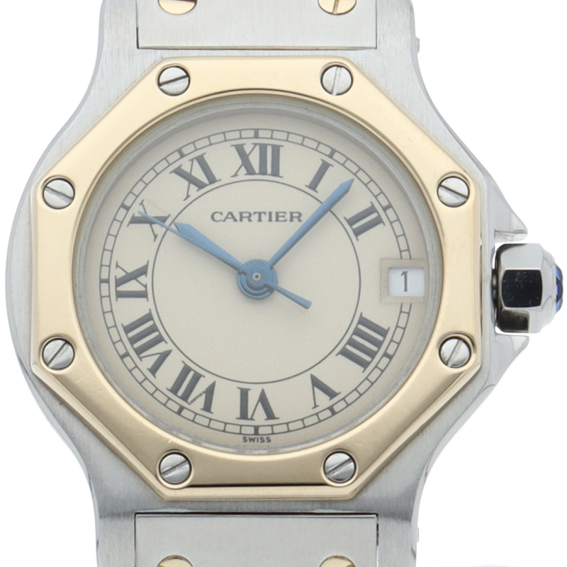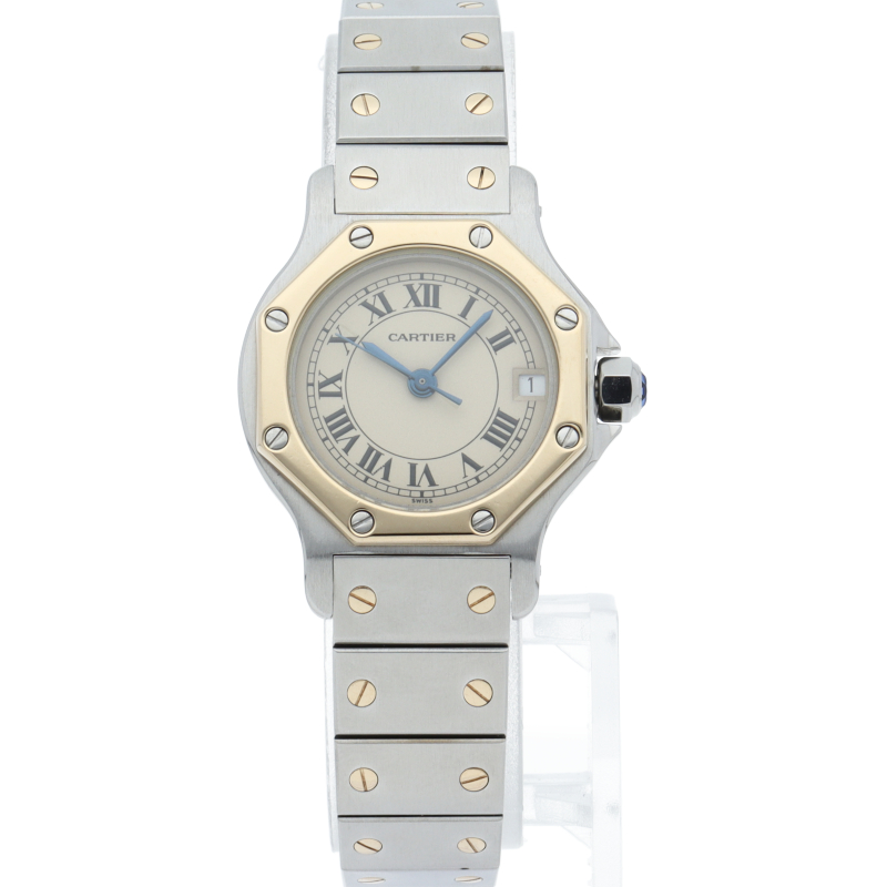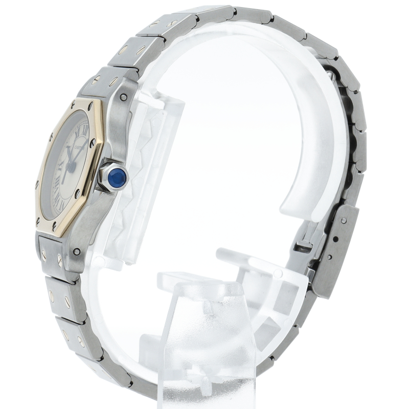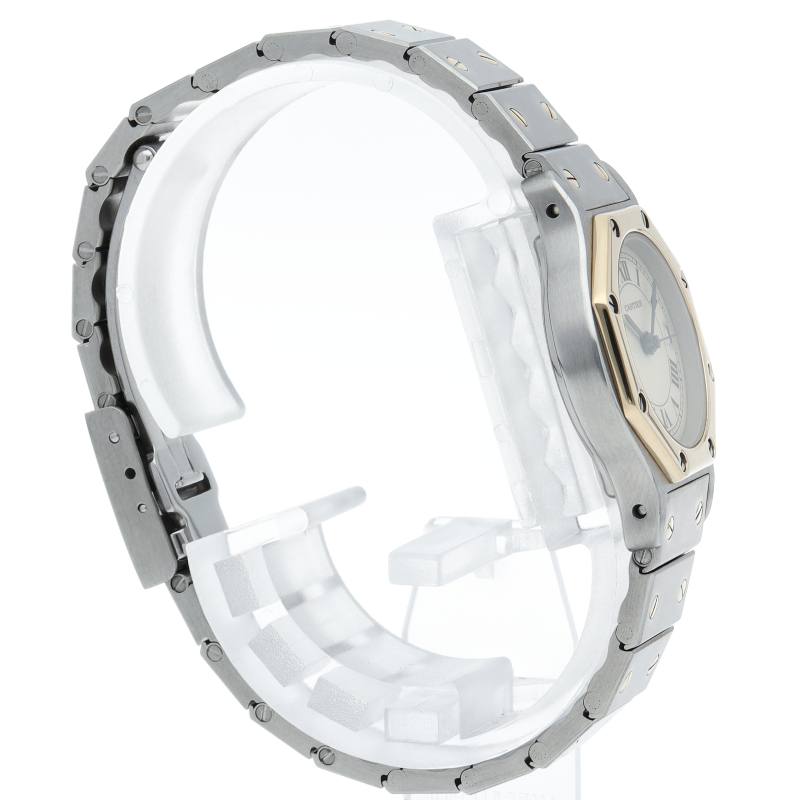 サントスオクタゴンは現行モデルには無い8角形(オクタゴン)ケースとサントスのモチーフである「ビス」がベゼルとブレスレットに打ちつけられているのが特徴的で、生産終了後も人気のモデルです。シャープでクラシカルな印象を与える個性派向けのモデル。