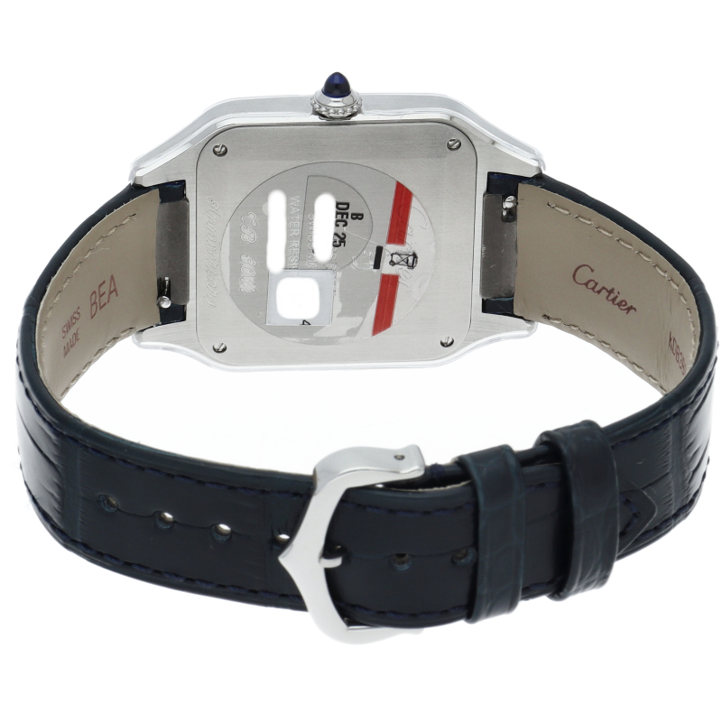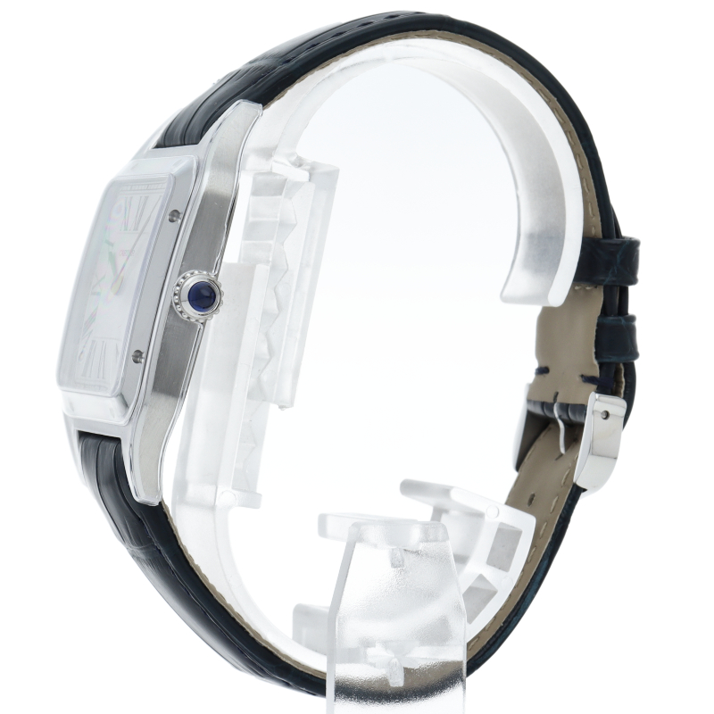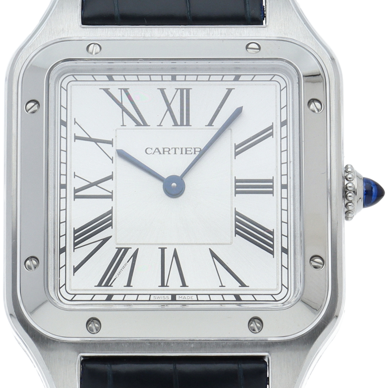 1904年、ルイ・カルティエが、友人で有名なブラジル人飛行士のアルベルト・サントス・デュモンの飛行中に時刻を確認したいという願いを聞いて製作されたのが「サントスウォッチ」です。こちらはデュモンの特徴ともいえる薄型ケースをクォーツムーブメントを搭載することで可能としたケース径31.4mmのメンズモデルです。