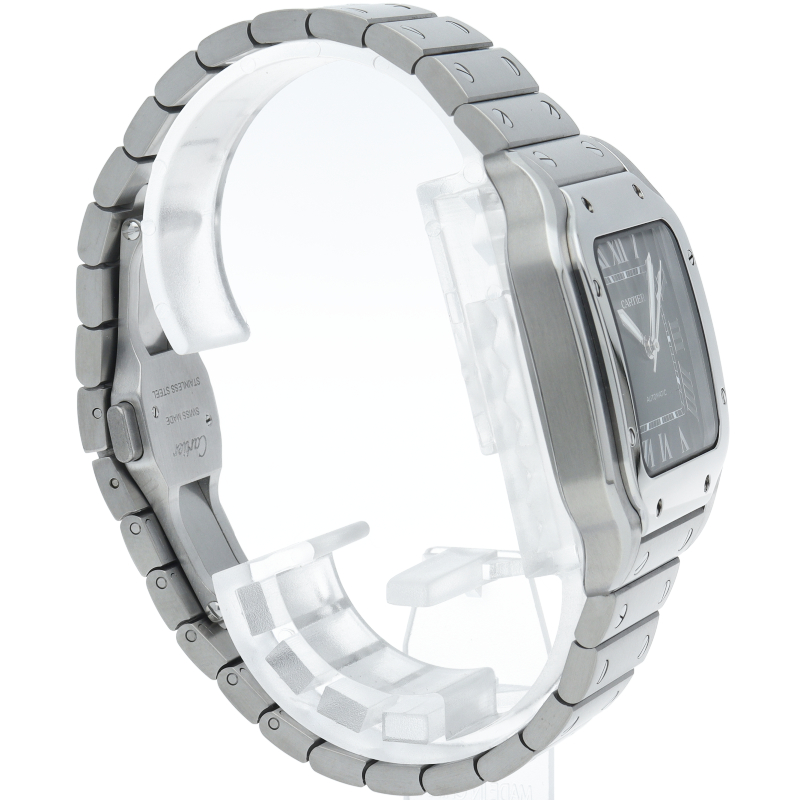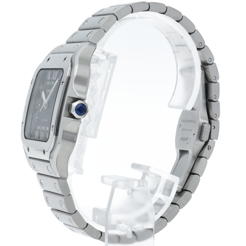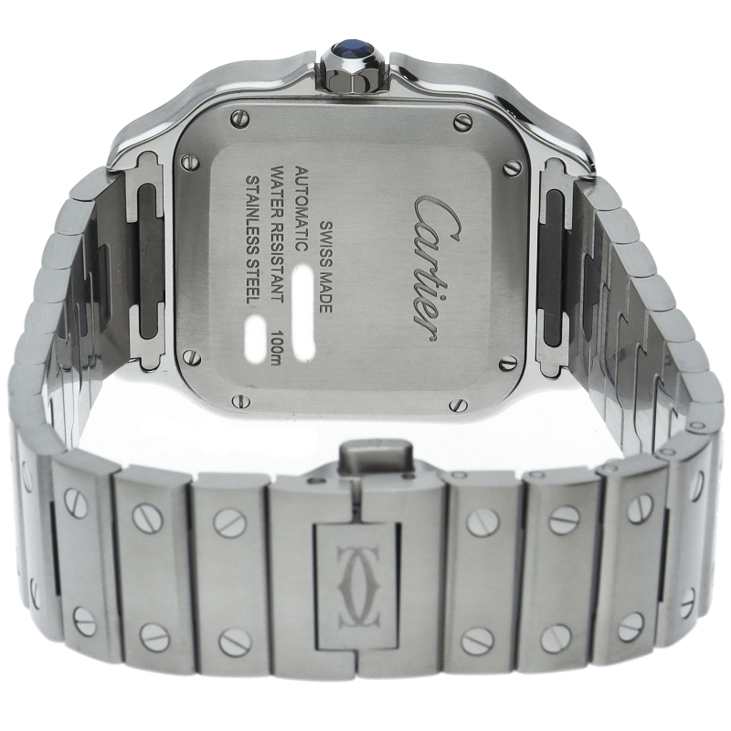 ムーブメントには自社製自動巻きキャリバー1847MCを搭載します。文字盤のローマインデックスとその内側に描かれた四角のレイルウェイ分目盛はカルティエウォッチを特徴づけ、またケースとブレスレットにはサントスウォッチ特有のビスモチーフが施されています。