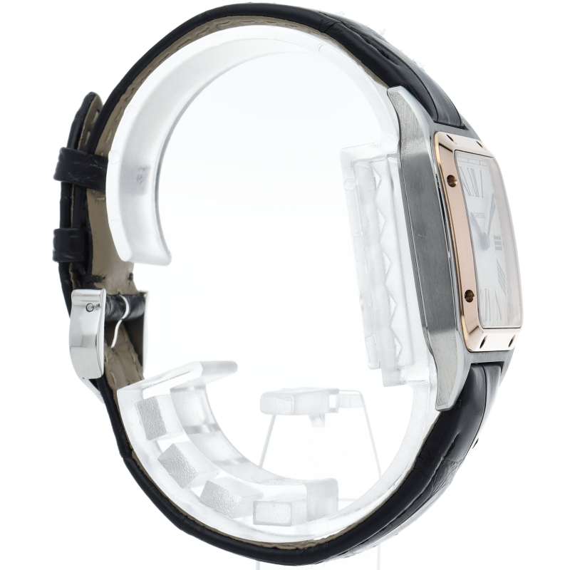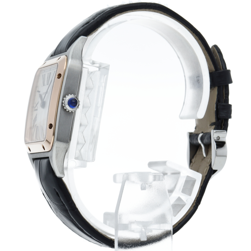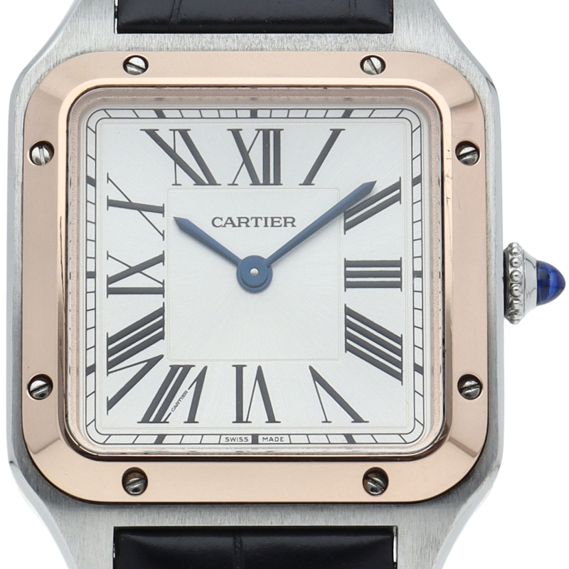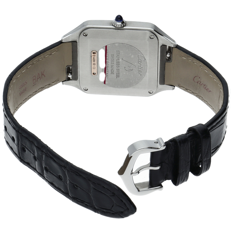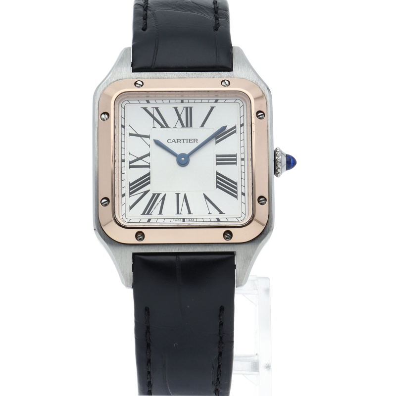 1904年にルイ・カルティエが、友人であるブラジル人飛行士アルベルト・サントス=デュモンのために作られたとされる「サントス」。幾何学的なフォルムとカルティエを象徴するビスモチーフが用いられた伝統的なデザインに、従来の約2倍の電池寿命6年という最新のクォーツ式のムーブメントを搭載しています。