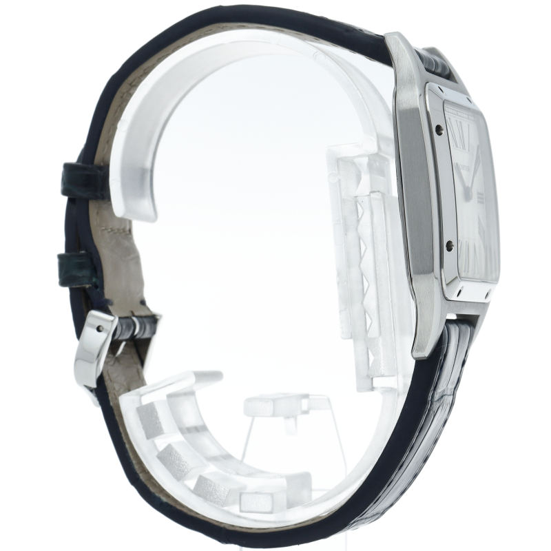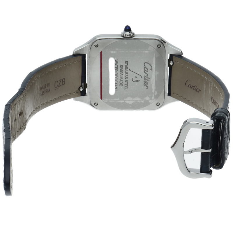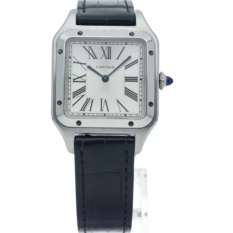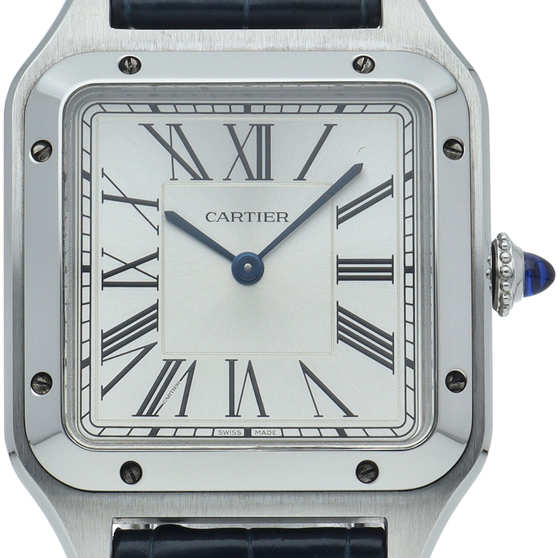 1904年、ルイ・カルティエが、友人で有名なブラジル人飛行士のアルベルト・サントス・デュモンの飛行中に時刻を確認したいという願いを聞いて製作されたのが「サントスウォッチ」です。こちらはデュモンの特徴ともいえる薄型ケースをクォーツムーブメントを搭載することで可能としたケース径31.4mmのメンズモデルです。