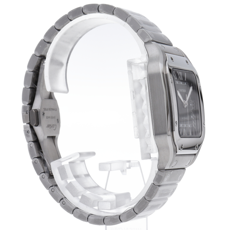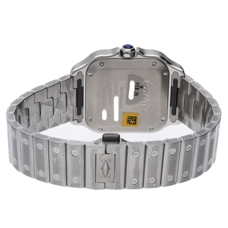 ムーブメントには自社製自動巻きキャリバー1847MCを搭載します。文字盤のローマインデックスとその内側に描かれた四角のレイルウェイ分目盛はカルティエウォッチを特徴づけ、またケースとブレスレットにはサントスウォッチ特有のビスモチーフが施されています。