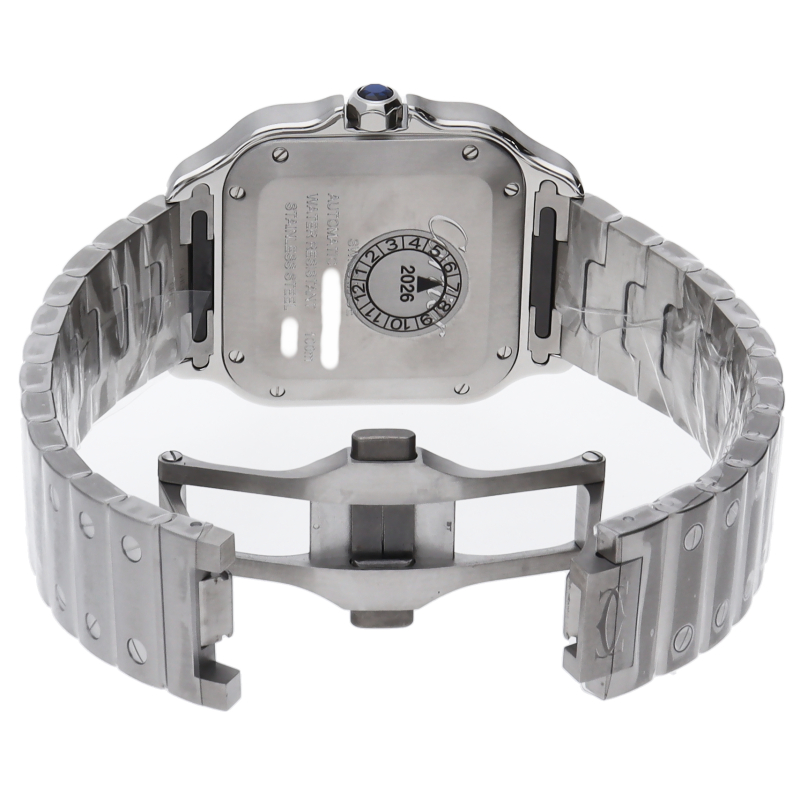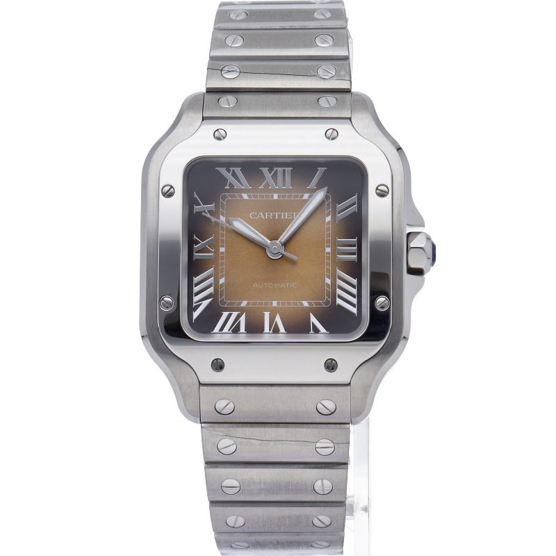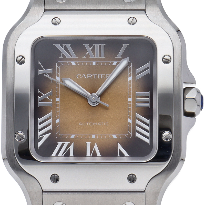 サントス ドゥ カルティエ ウォッチ、ミディアムモデル、1847 MC 自動巻きムーブメント。ステンレススティール製ケース、七角形のリューズにファセットを施したブルー シンセティックブスピネル、サテン仕上げグラデーションブラウン サンレイブラッシュ ダイアル、蛍光仕上げロジウム加工ポリッシュスティール製剣型針、サファイアクリスタル。