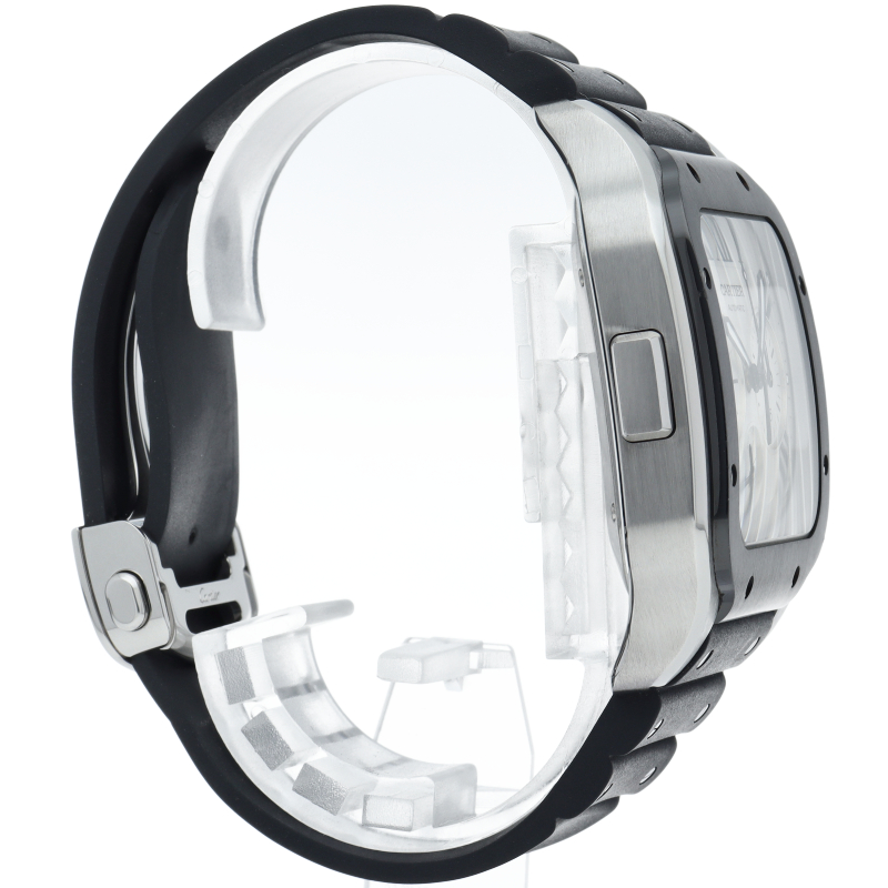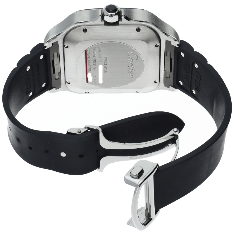 2018年にモデルチェンジされたサントス ドゥ カルティエの入荷です。新たに設計され、43.3mmの迫力あるXLサイズのケースに、カルティエ自社製の1904 CH MCムーヴメントを搭載。従来のクロノグラフとは違いスタート、リセットのボタンが無く、ケース9時側にあるプッシュボタンとリューズで操作する斬新なデザインの時計です。容易にベルト交換が行える「クイックスイッチ」を搭載しております。