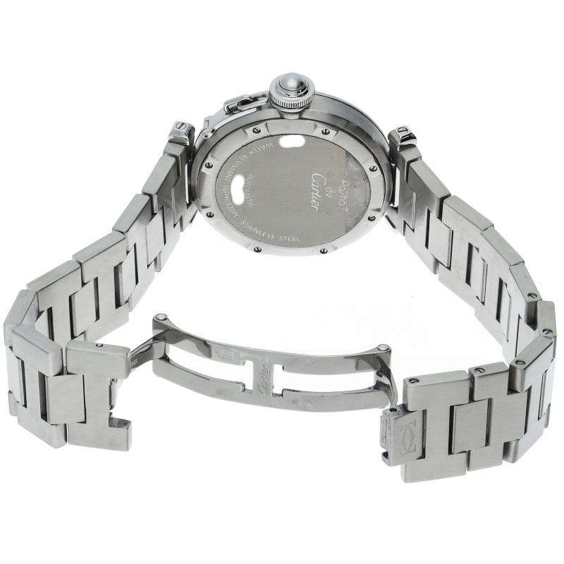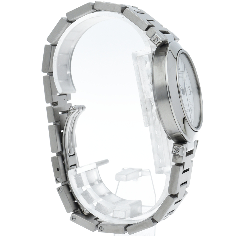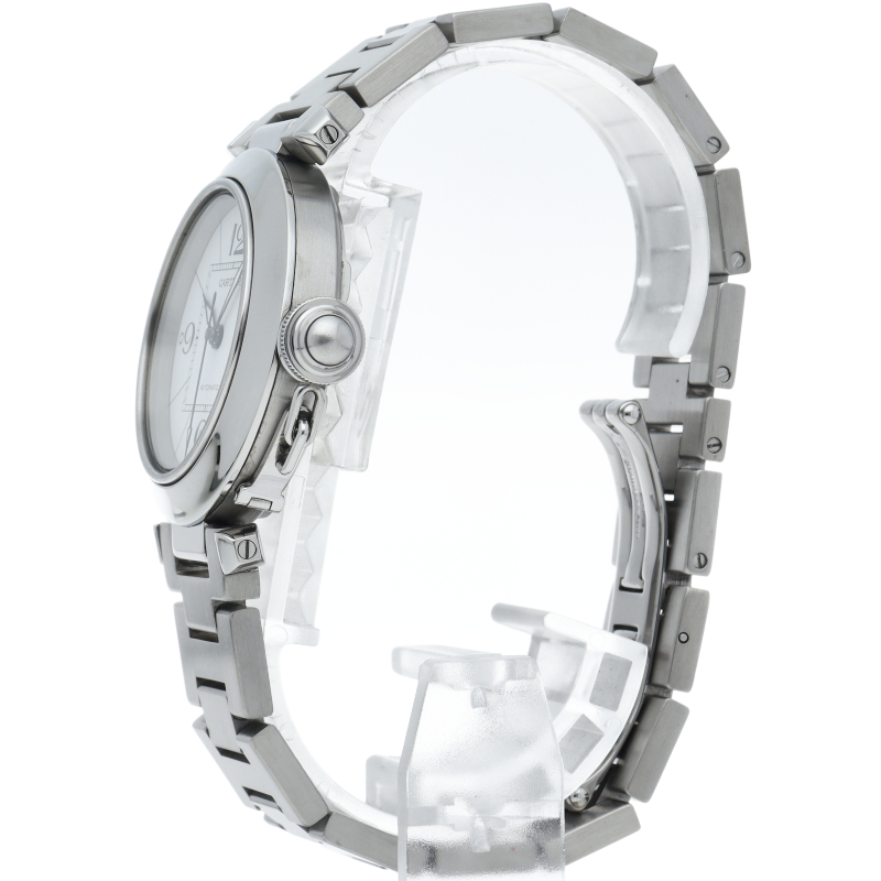 カルティエの人気パシャCシリーズ。4時と5時の間にデイト表示機能が付いた実用性のある1本。どんなシーンにも活用できるラウンドケースがオシャレです。