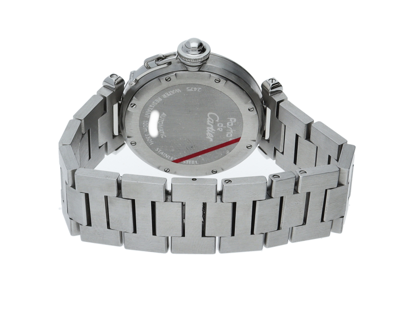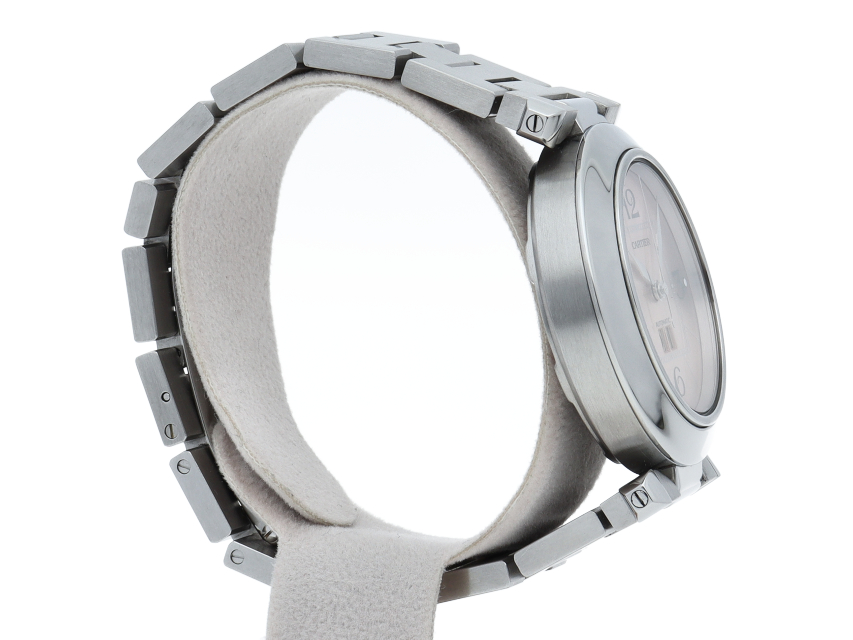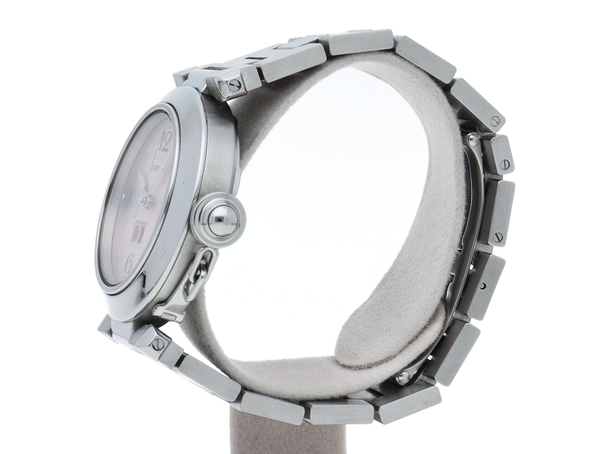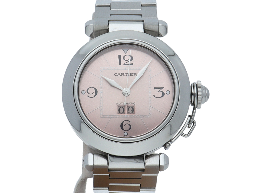 カルティエの人気「パシャC」シリーズ。大きい日付表示が特徴的なビッグデイト。視認性も良くどんなシーンにも活用できるラウンドケースがオシャレな1本。