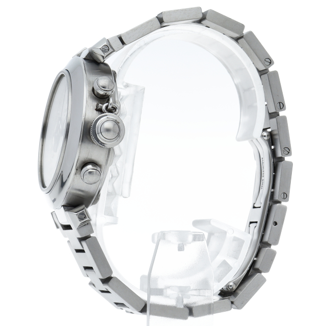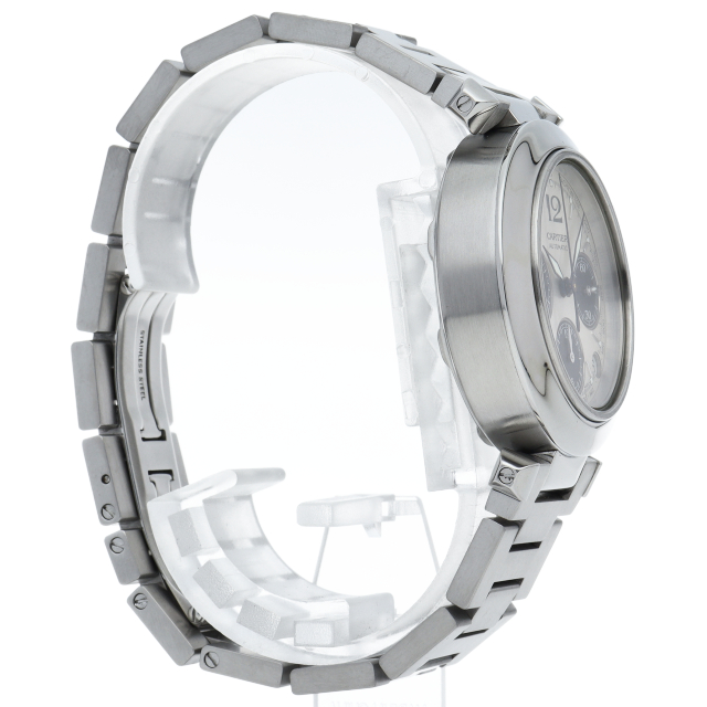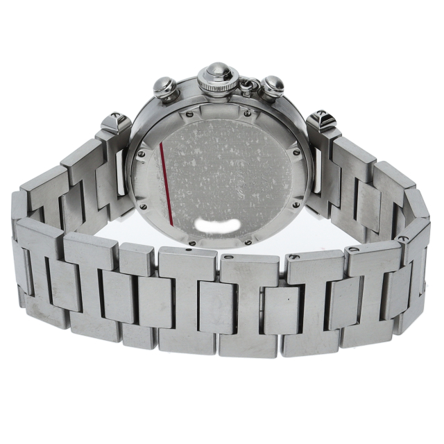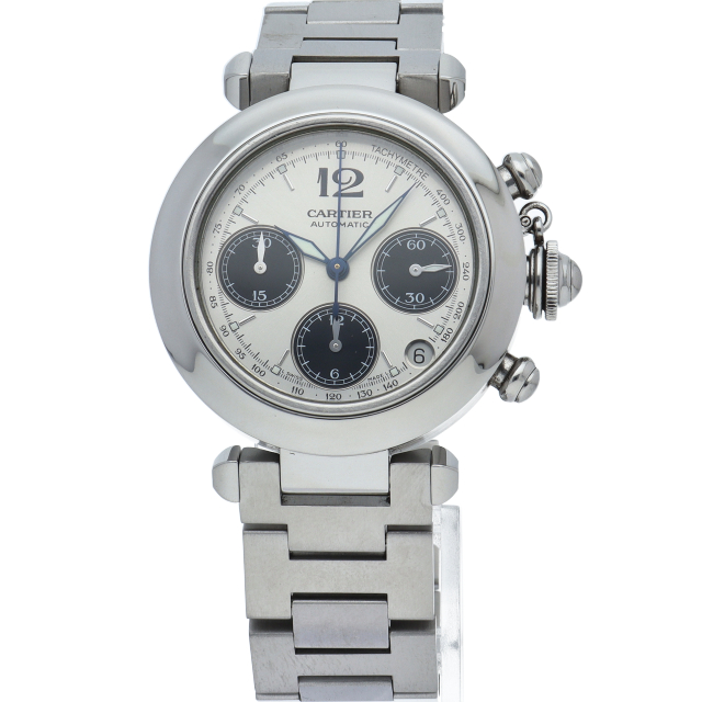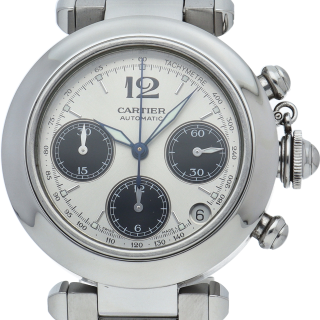 カルティエの人気「パシャC」シリーズ。クロノグラフを搭載したモデルでシルバーと黒の文字盤がシンプルかつお洒落な商品となっております。