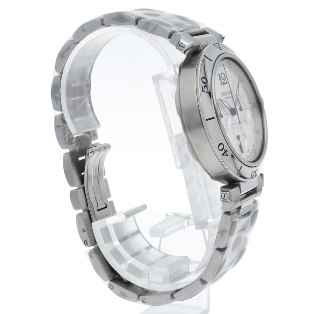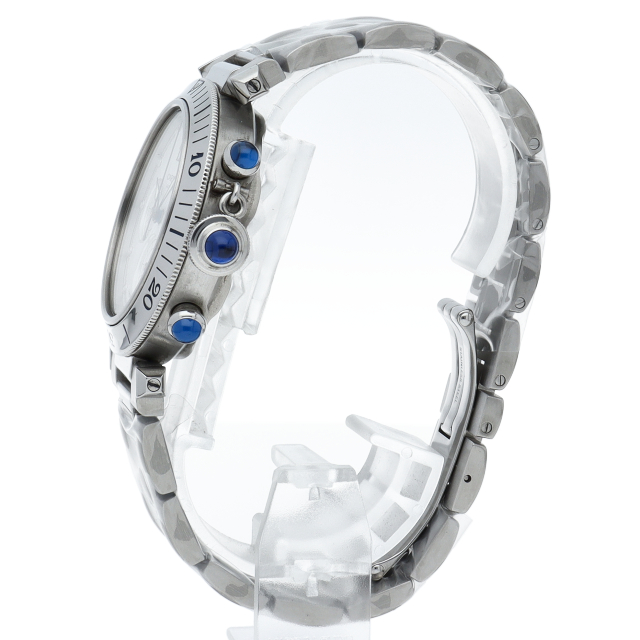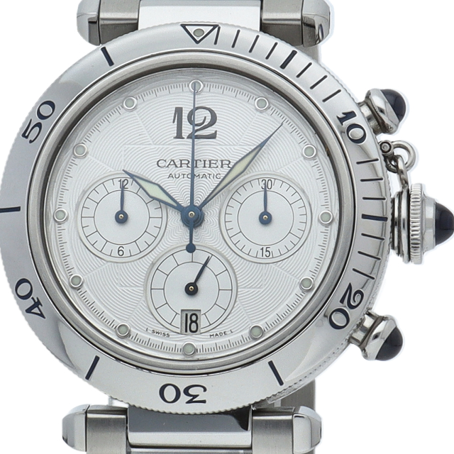 クロノグラフを搭載した38ミリケースのパシャ。ギョーシェ彫が施されたシルバー文字盤が上品です。リューズプロテクターと同じくブルーのプッシュボタンが、ラグジュアリー感を一層上げています。