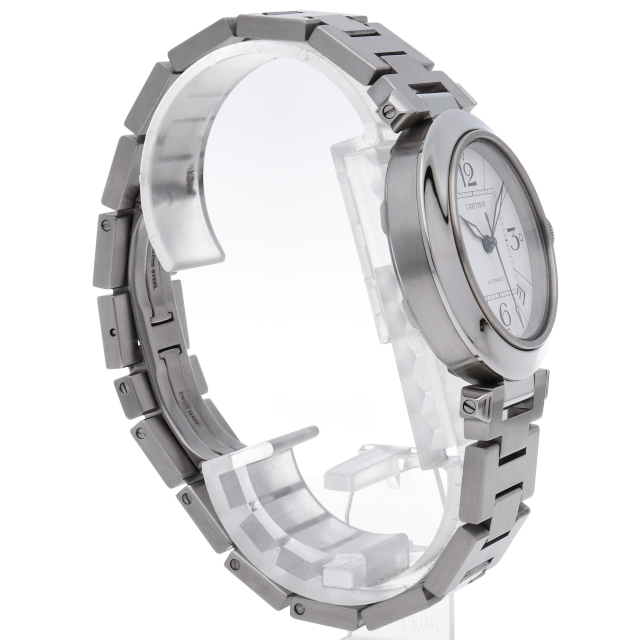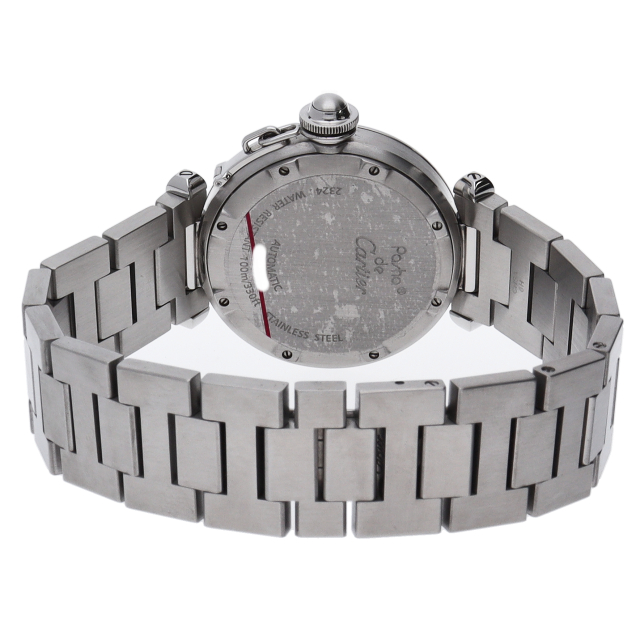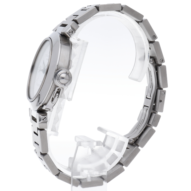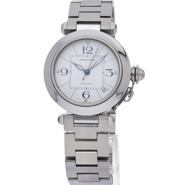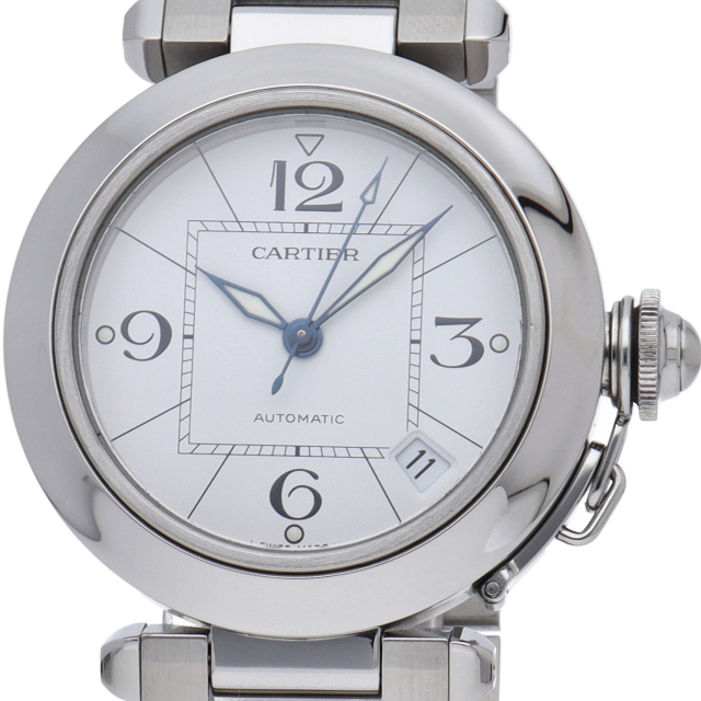 カルティエの人気パシャCシリーズ。4時と5時の間にデイト表示機能が付いた実用性のある1本。どんなシーンにも活用できるラウンドケースがオシャレです。
