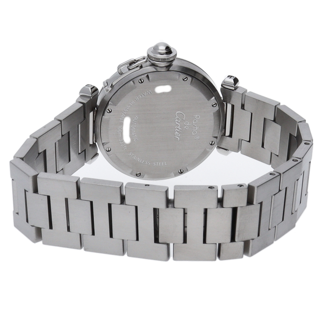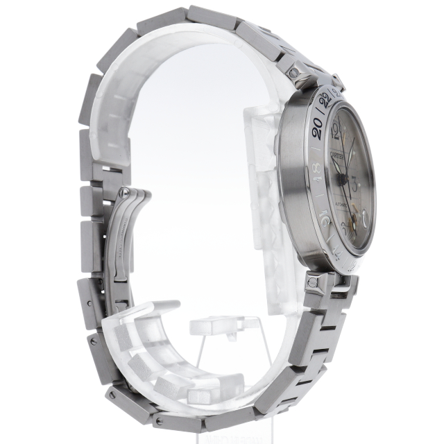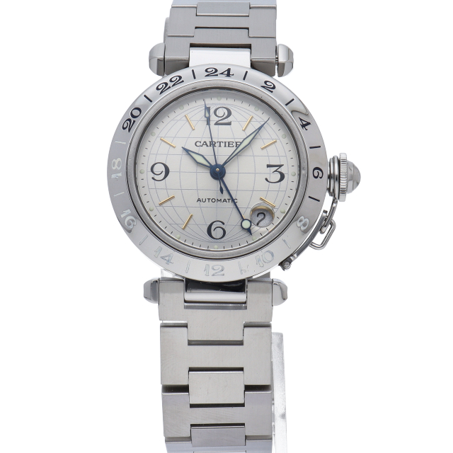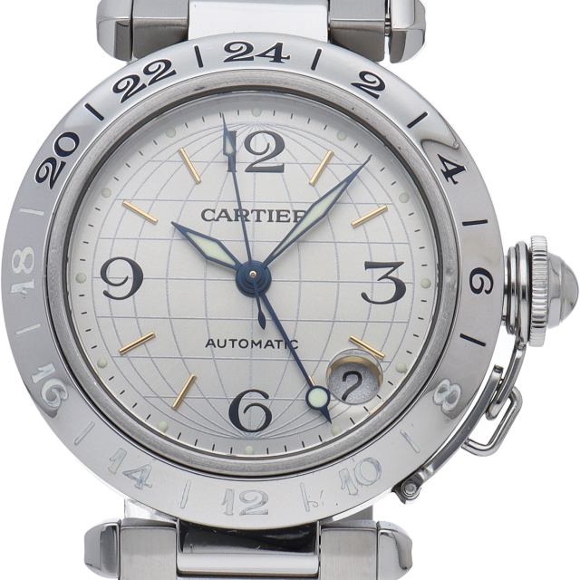 カルティエの人気「パシャC」シリーズ。文字盤に地球儀をモチーフにした放射線状のデザインを持つ、GMT機能搭載モデル。