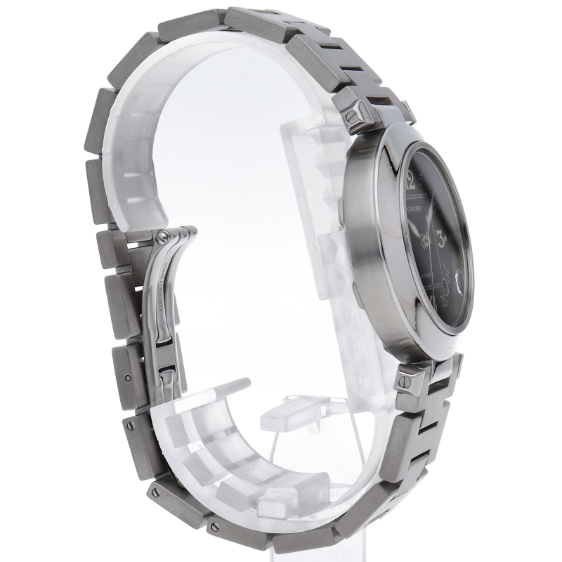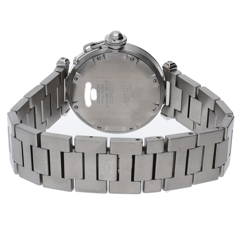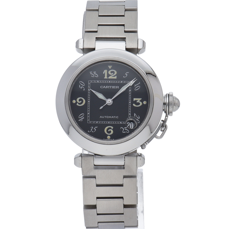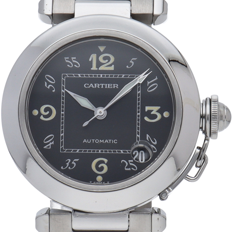 カルティエの人気パシャCシリーズ。4時と5時の間にデイト表示機能が付いた実用性のある1本。どんなシーンにも活用できるラウンドケースがオシャレです。