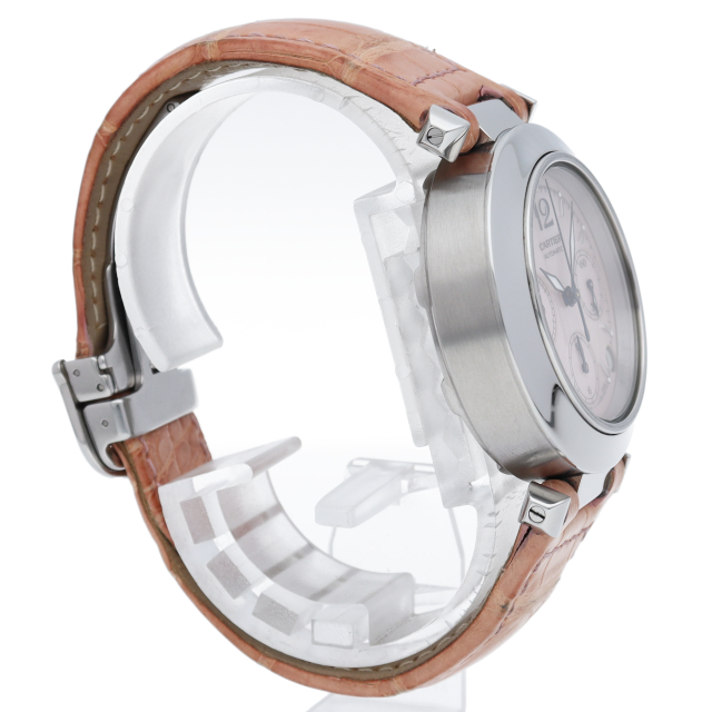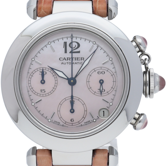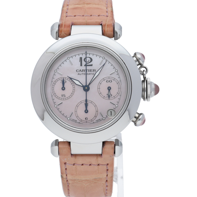 カルティエの人気「パシャC」シリーズ。ピンクのシェルダイヤルが可愛らしいこのモデル、リューズのカボションもピンクに変更され、ピンクのベルトが良く合っています。