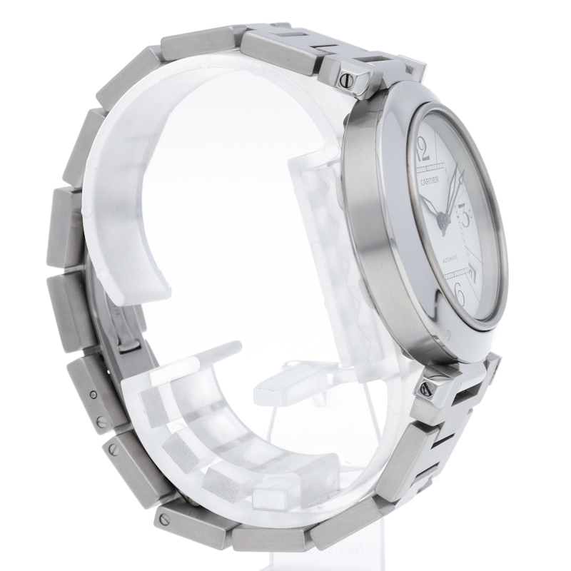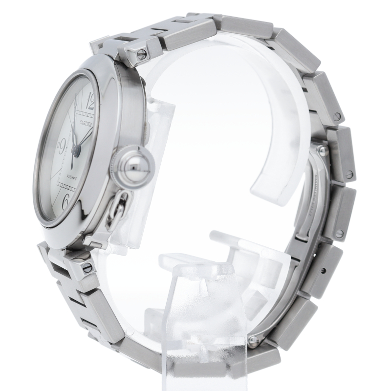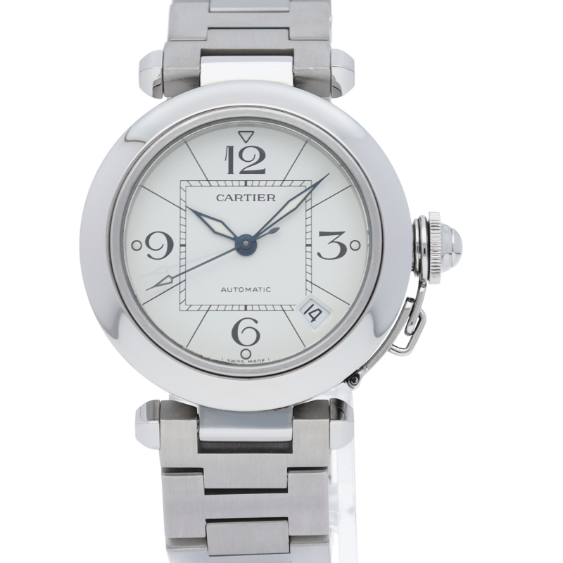 カルティエの人気パシャCシリーズ。4時と5時の間にデイト表示機能が付いた実用性のある1本。どんなシーンにも活用できるラウンドケースがオシャレです。