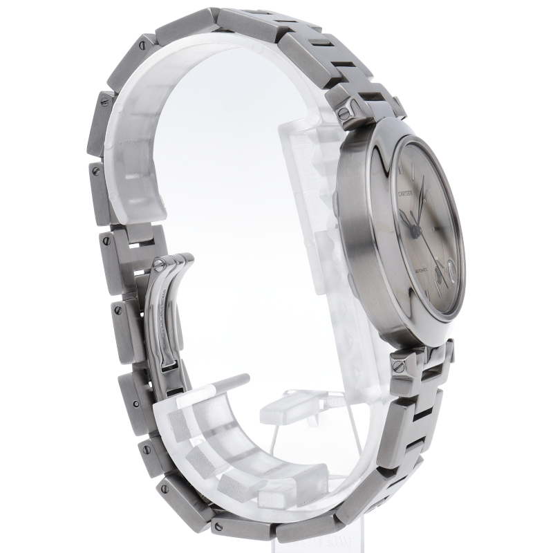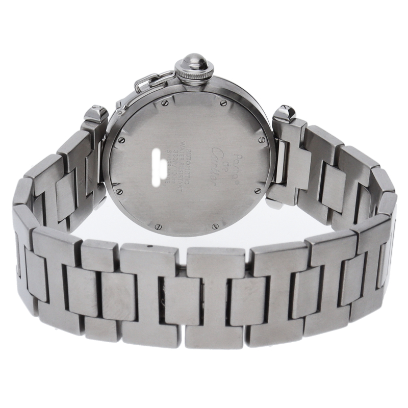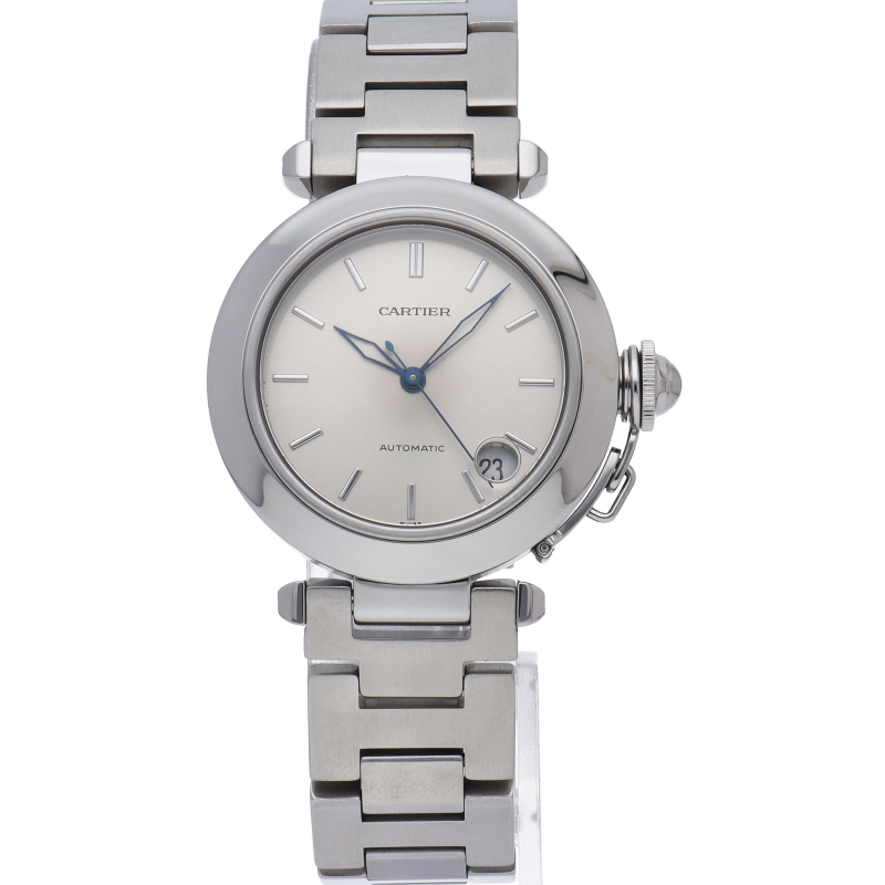 カルティエの人気パシャCシリーズ。4時と5時の間にデイト表示機能が付いた実用性のある1本。どんなシーンにも活用できるラウンドケースがオシャレです。